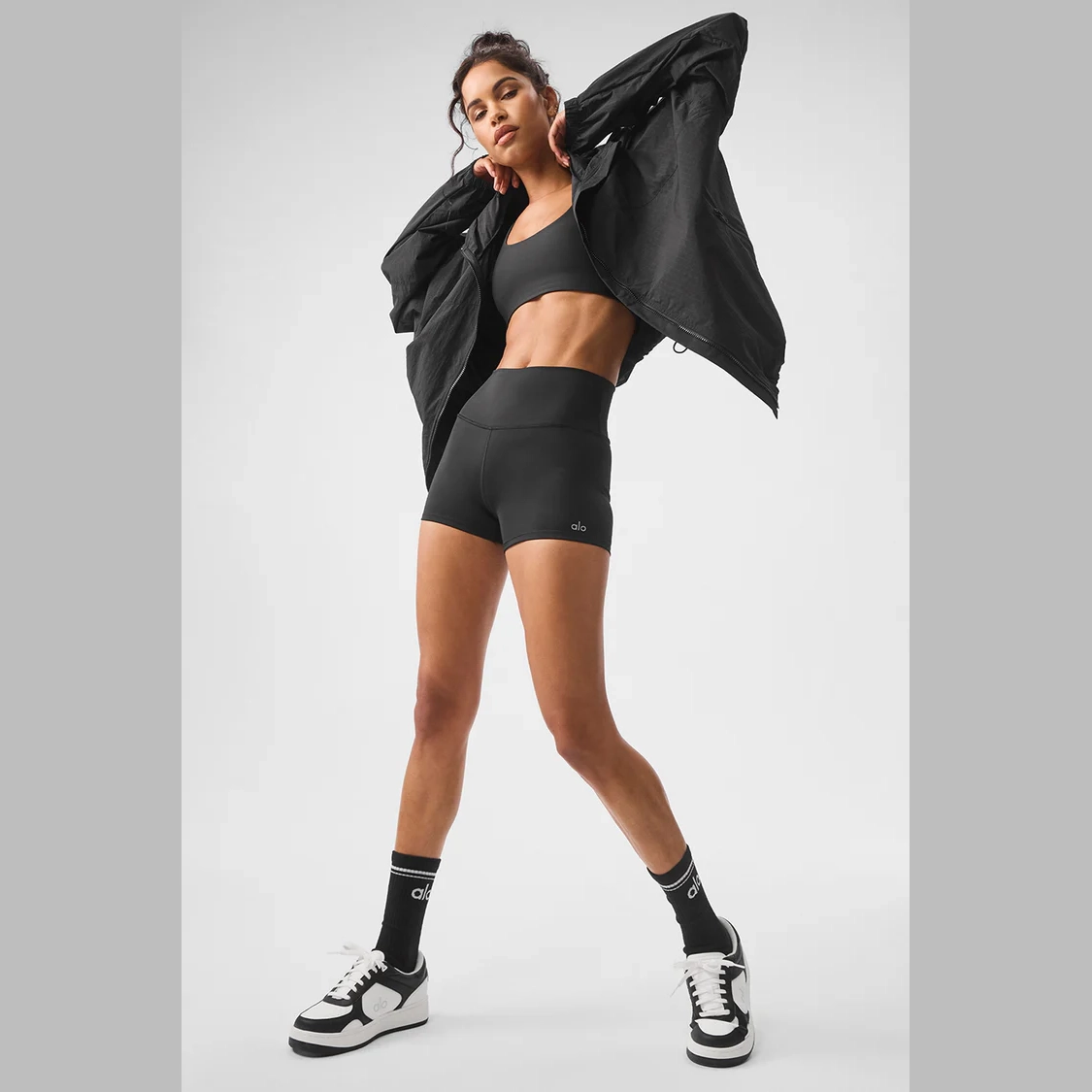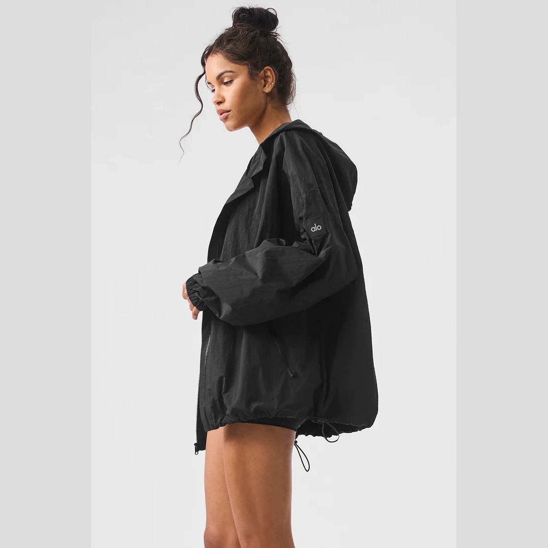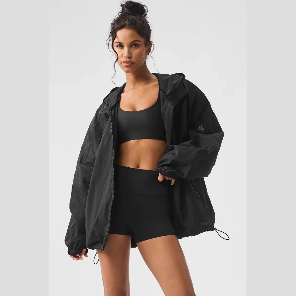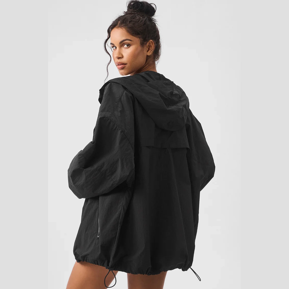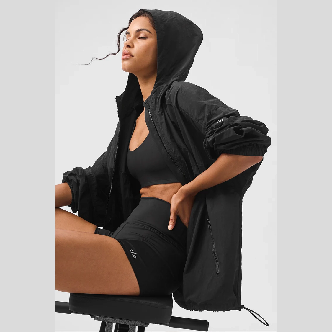 Light coverage and serious protection—that’s the Vantage Track Jacket. It has technical features like a structured hood, a full-zip front that covers the neck, cuffed sleeves, and a bungee hem that’s slightly longer in back. Fitwise, it feels cool and modern with dropped shoulders and a loose body. Wear it for running, training, or stepping outside in brisk weather.