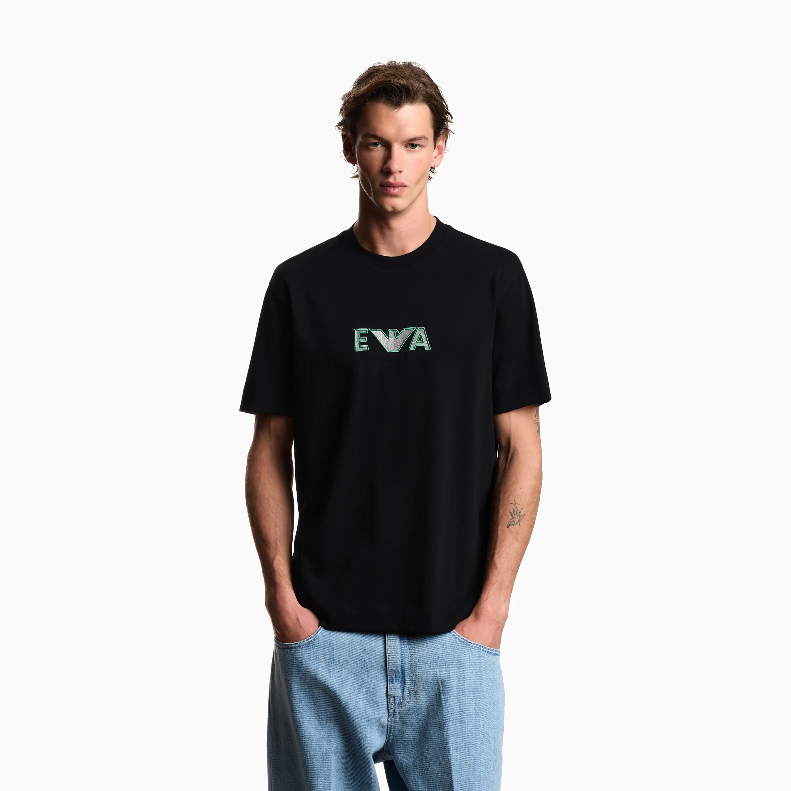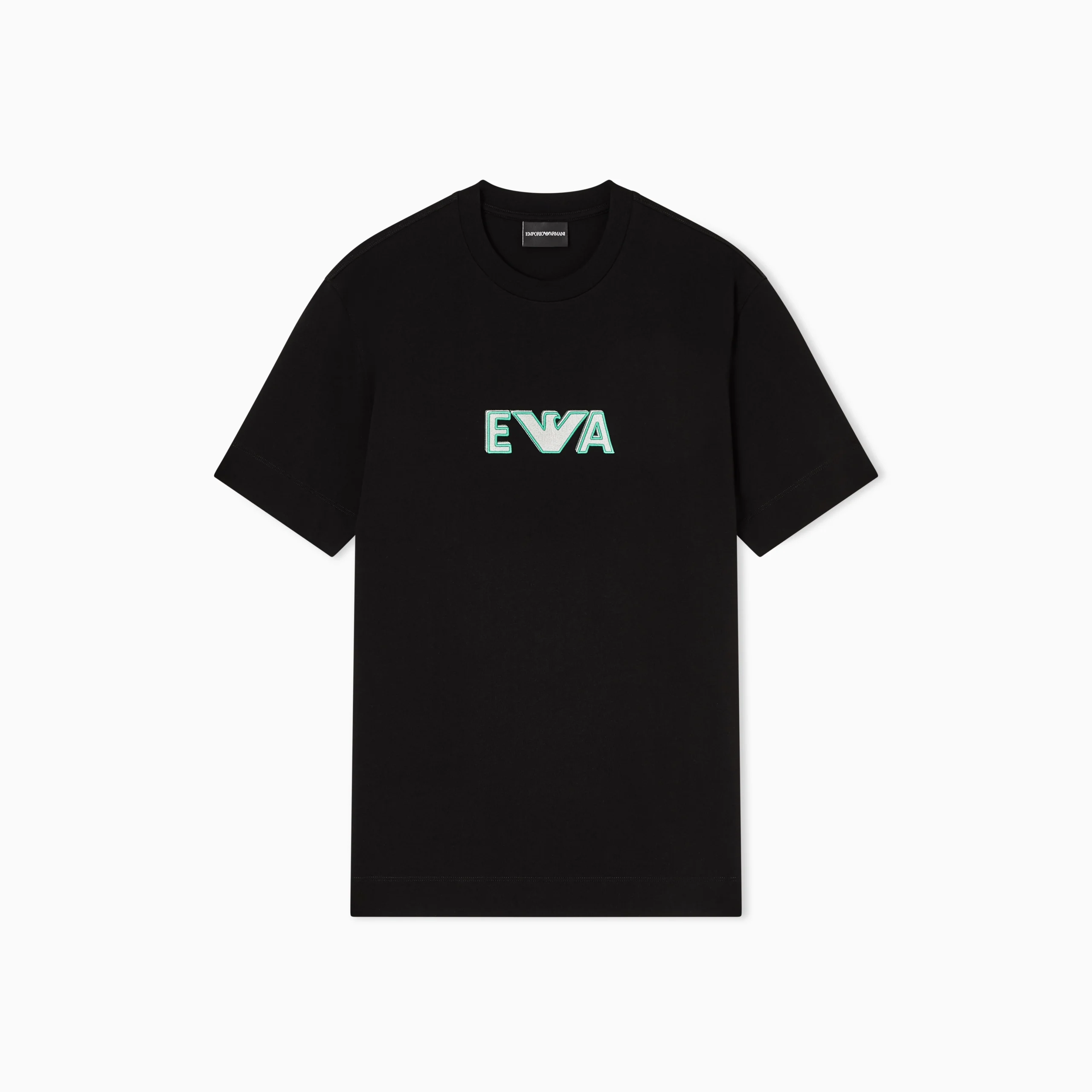 Crew-neck T-shirt made of heavyweight pure cotton jersey, with super-embossed logo enhanced by contrasting edges on a metallic-effect embroidered background. The Emporio Armani logo is a constant of undeniable style, whether it’s shown off, displayed or just hinted at.