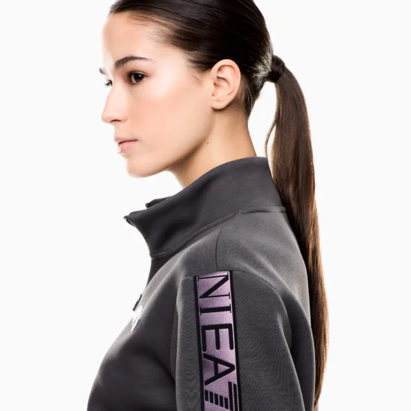 Minimalist, clean-lined tracksuit made of innovative Natural VENTUS7, a technical fabric composed of a mixture of natural and synthetic fibres that regulates body temperature by dissipating sweat as water vapour, while cotton fibres ensure a high level of comfort. A feminine and versatile style that can also be worn during leisure time when relaxing.