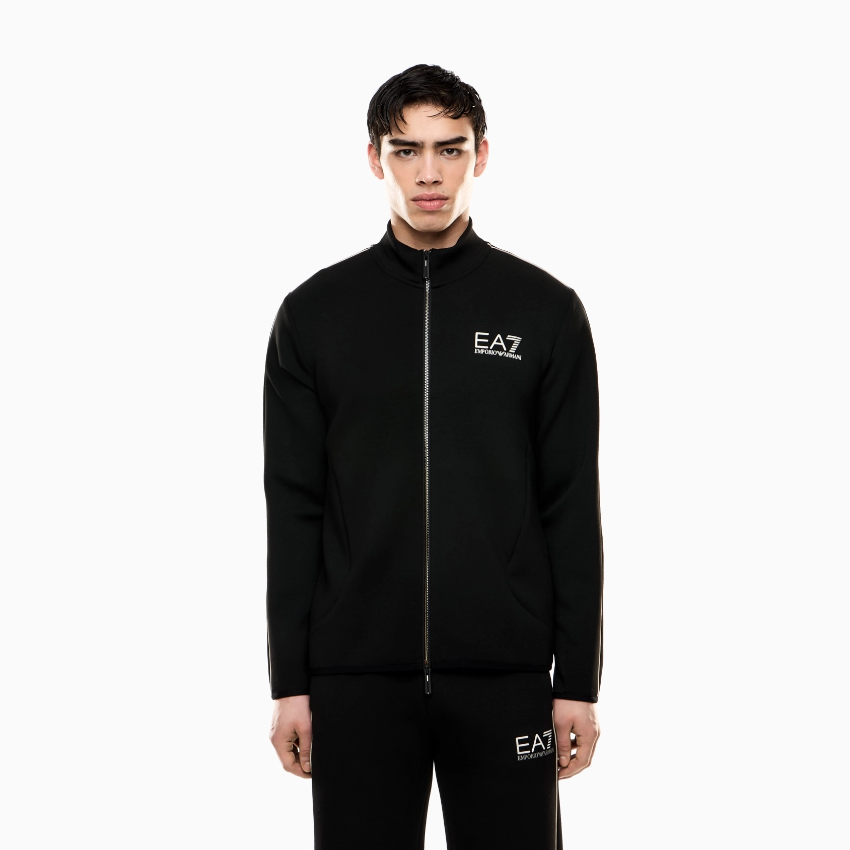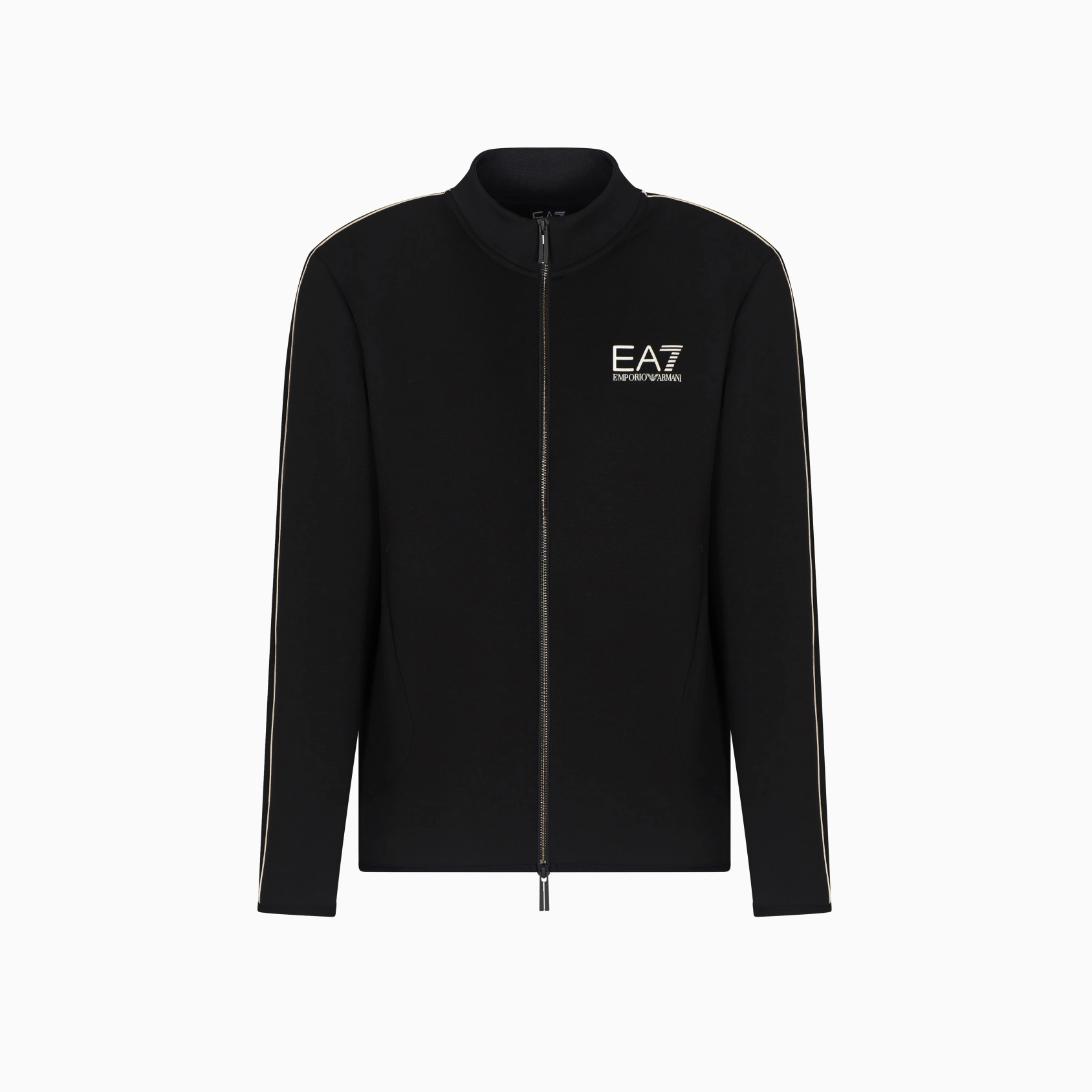 Zip-up sweatshirt made in a stretch viscose blend, featuring a zip closure and two vertical pockets. The style, customised with the EA7 logo in a gold finish on the chest, is part of the Gold Label selection, featuring a refined and elegant style: pieces made from comfortable fabrics and customised with an unmistakable gold touch, for an athletic, chic style
