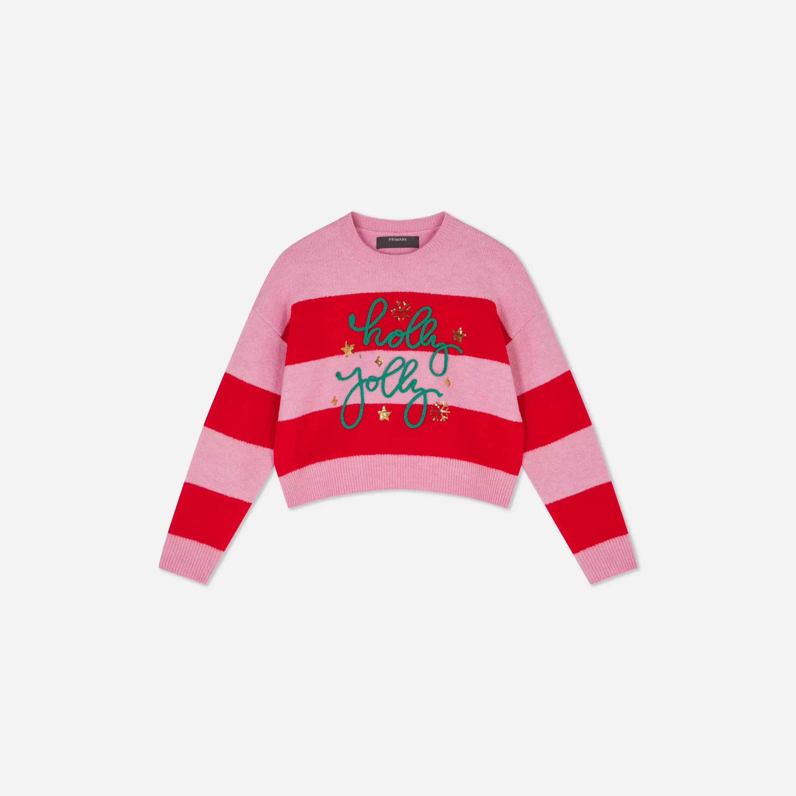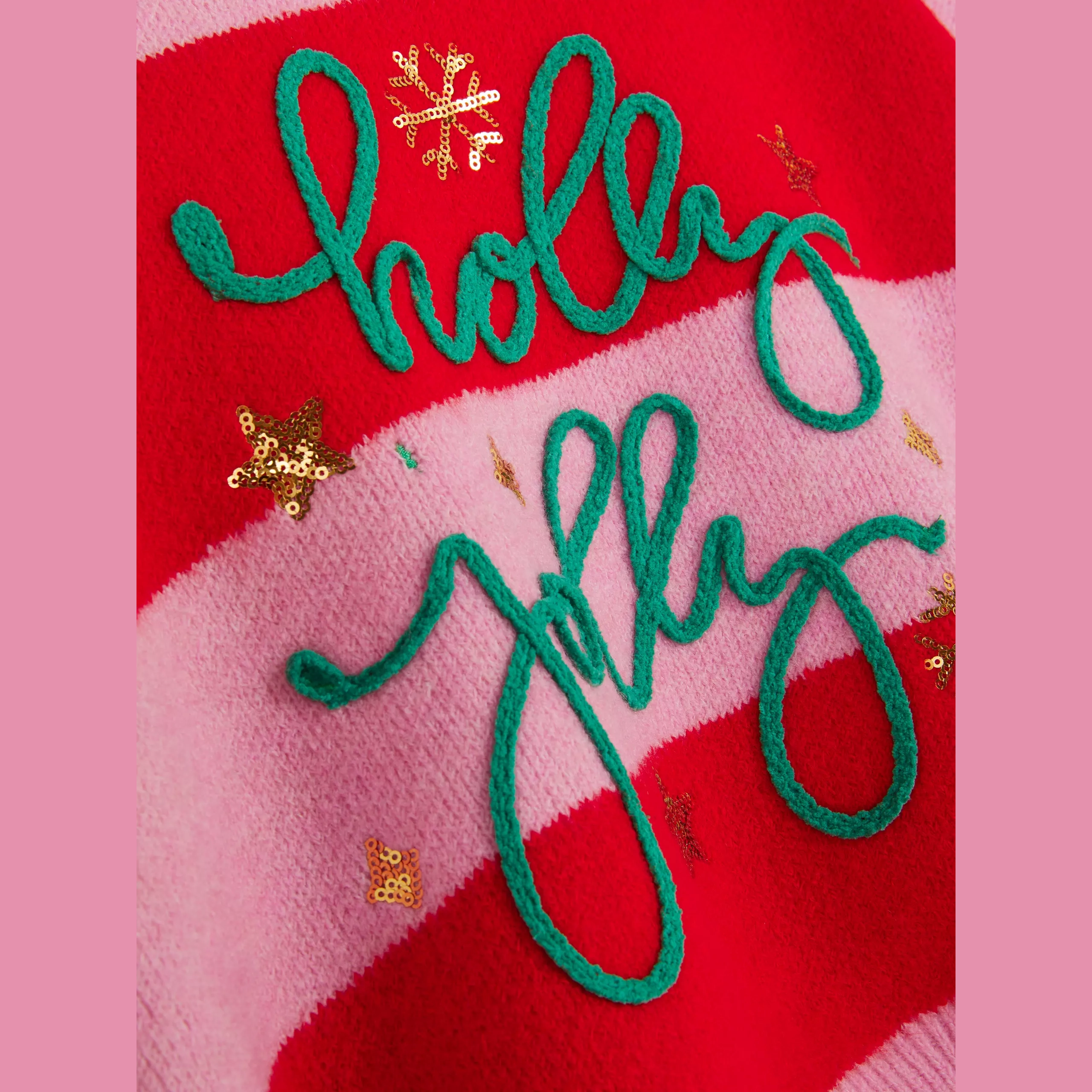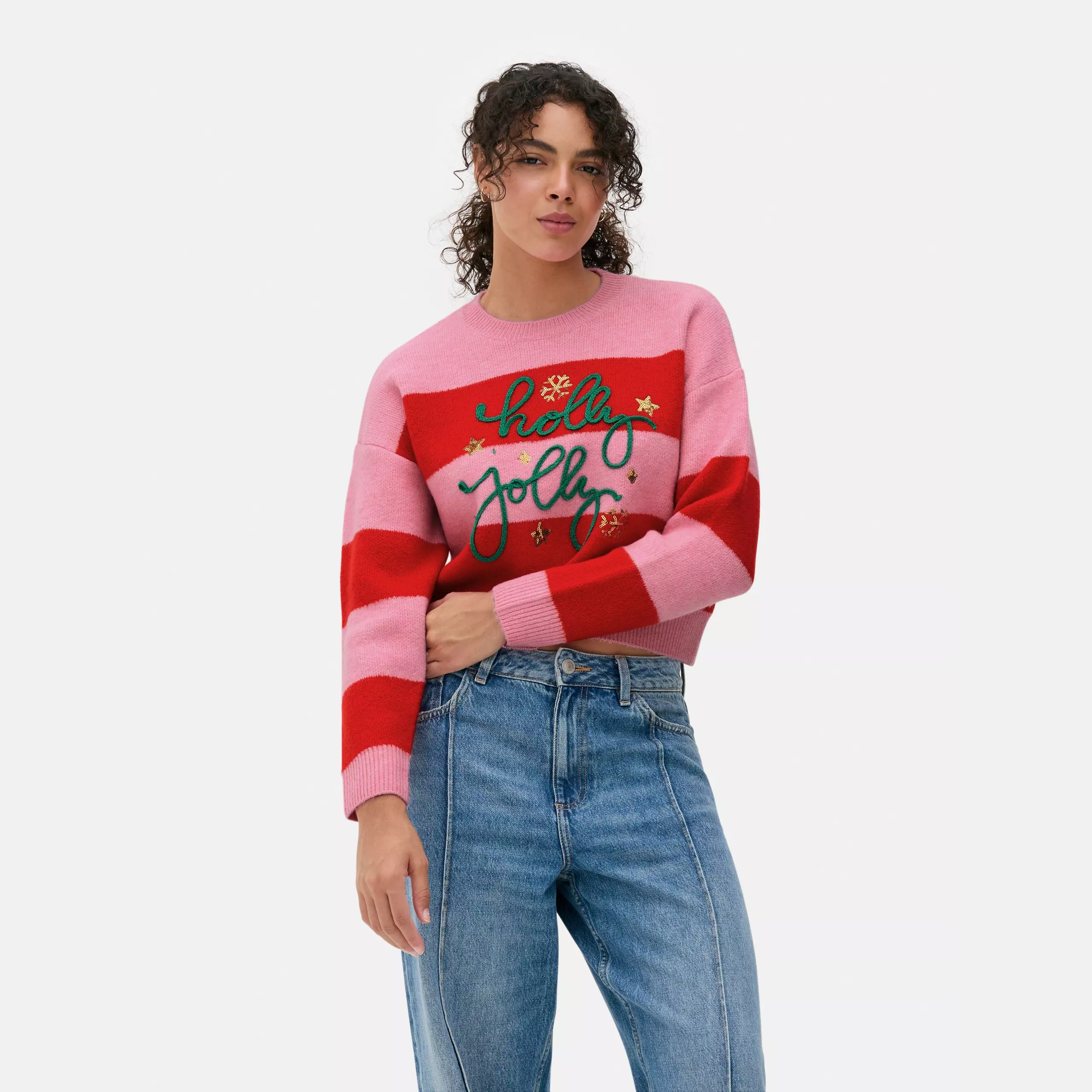Festive and cute, this Christmas sweater comes in a red and pink stripe with a ‘holly jolly’ embroidery on the front!