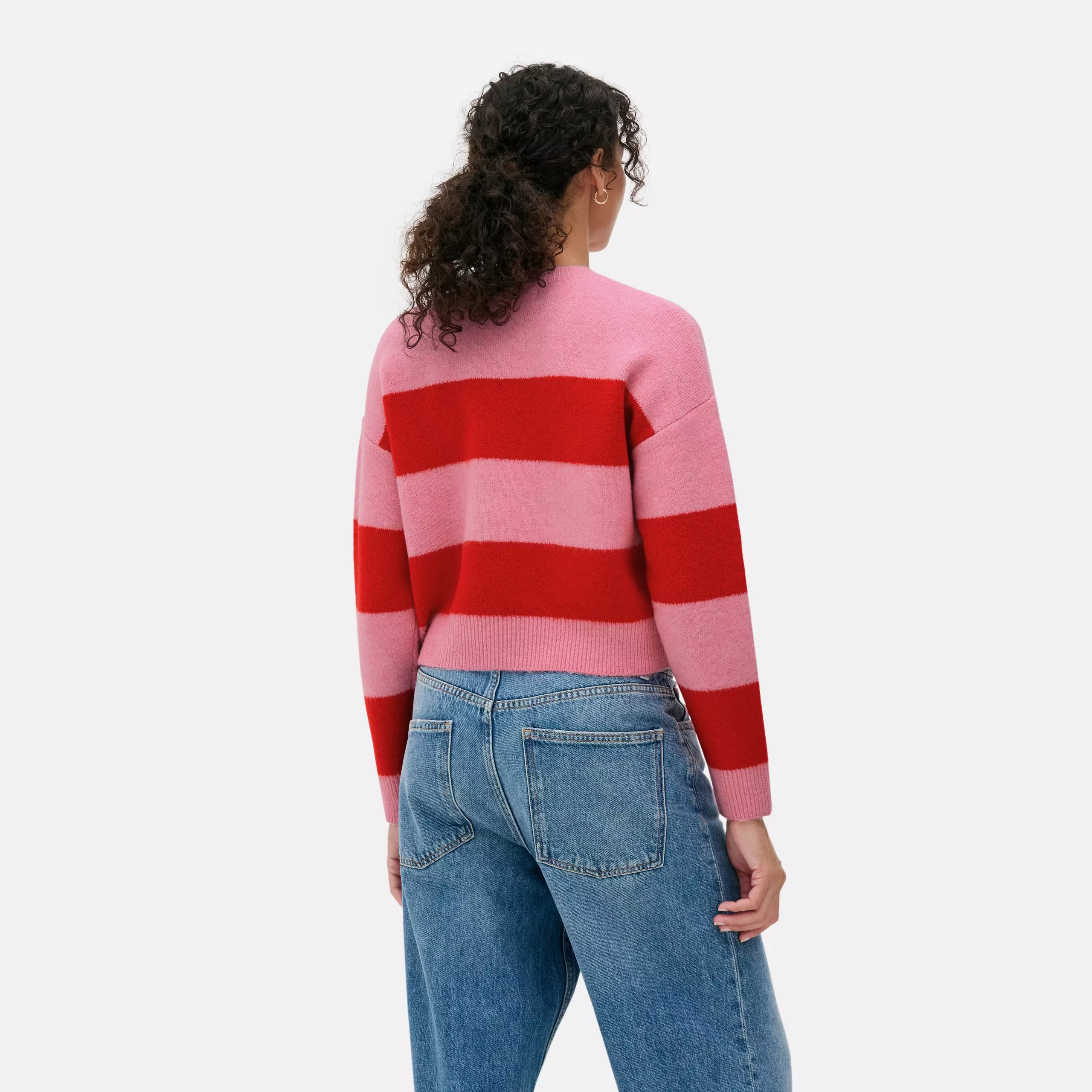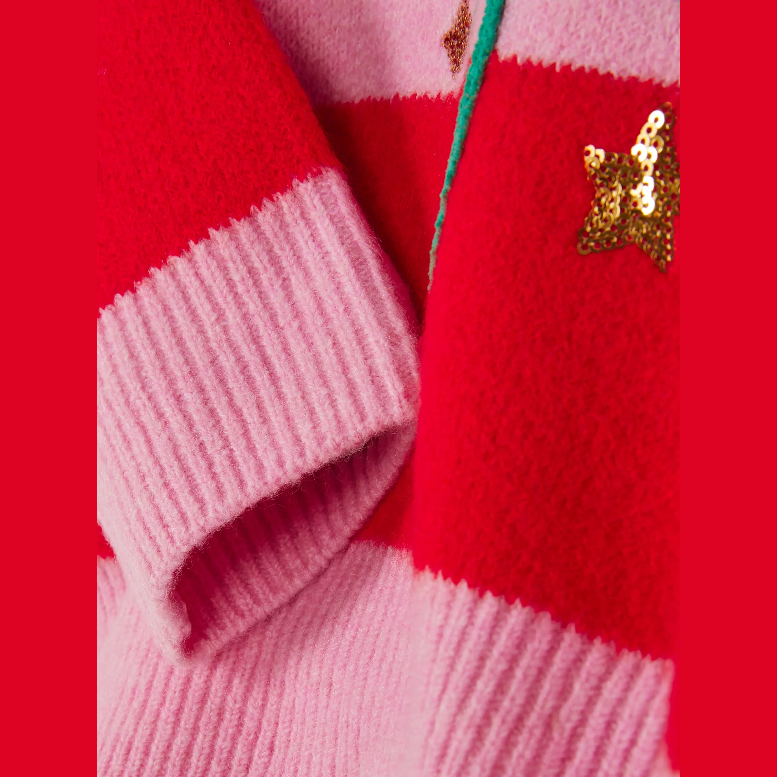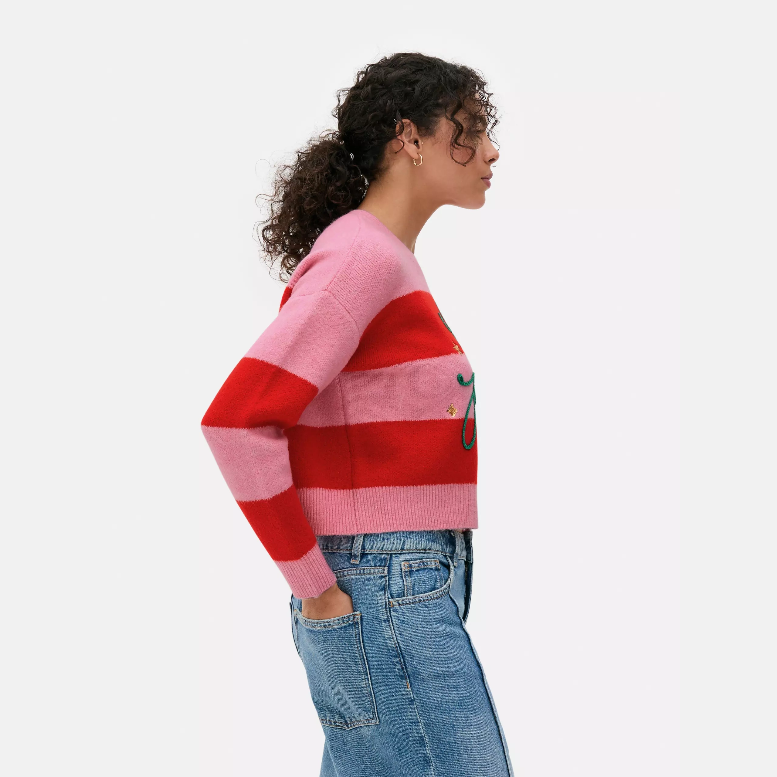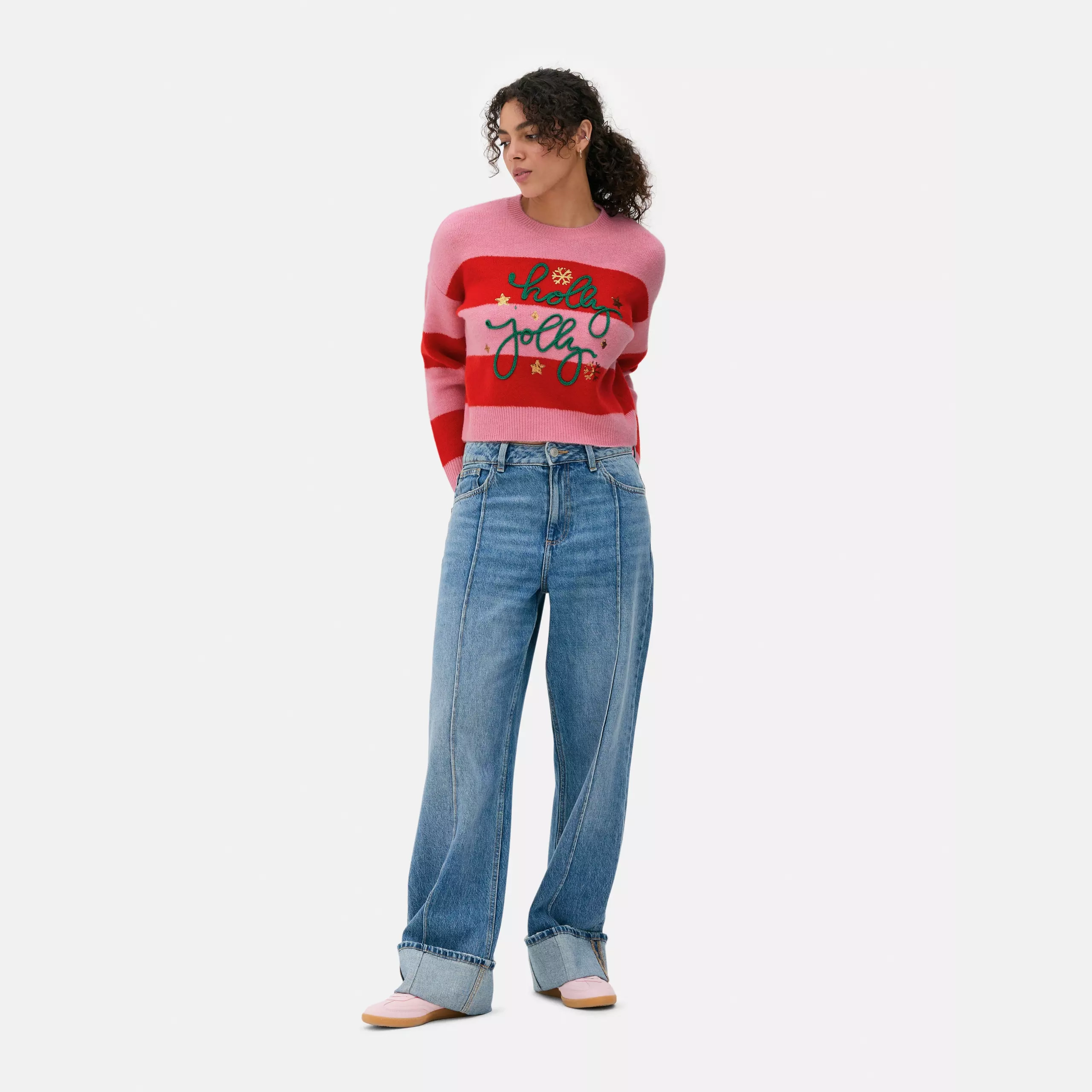 Festive and cute, this Christmas sweater comes in a red and pink stripe with a ‘holly jolly’ embroidery on the front!