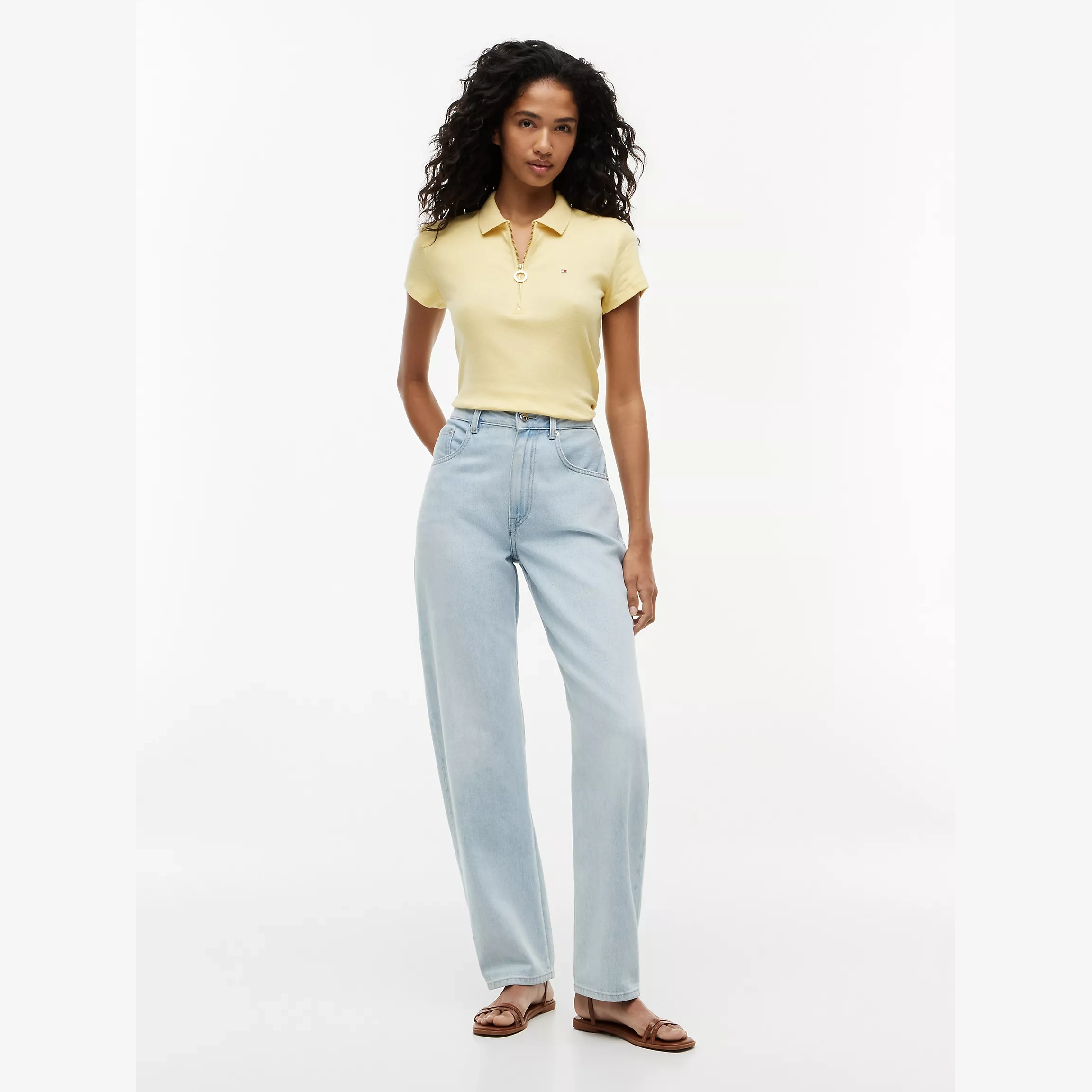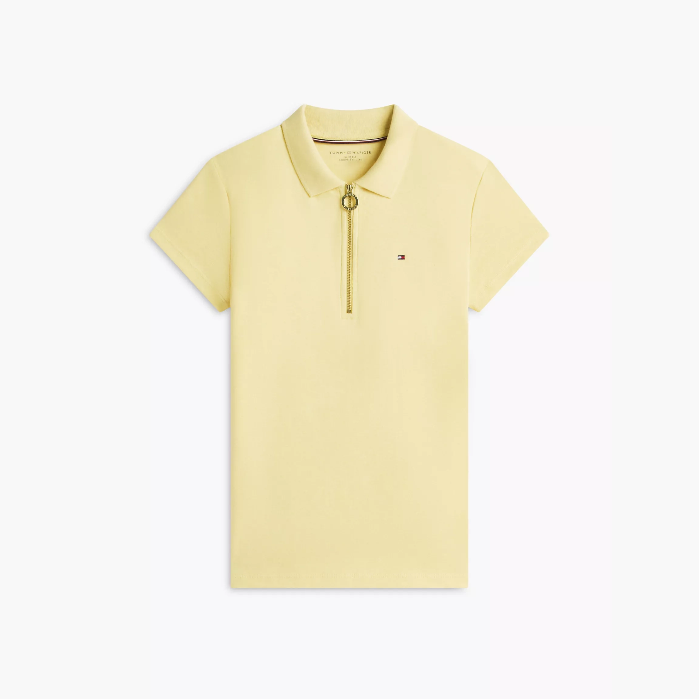 • Tommy Hilfiger women’s polo. Designed in a trim fit from premium cotton, this short-sleeve polo has an elevated feel, thanks to the gold-tone zip placket.