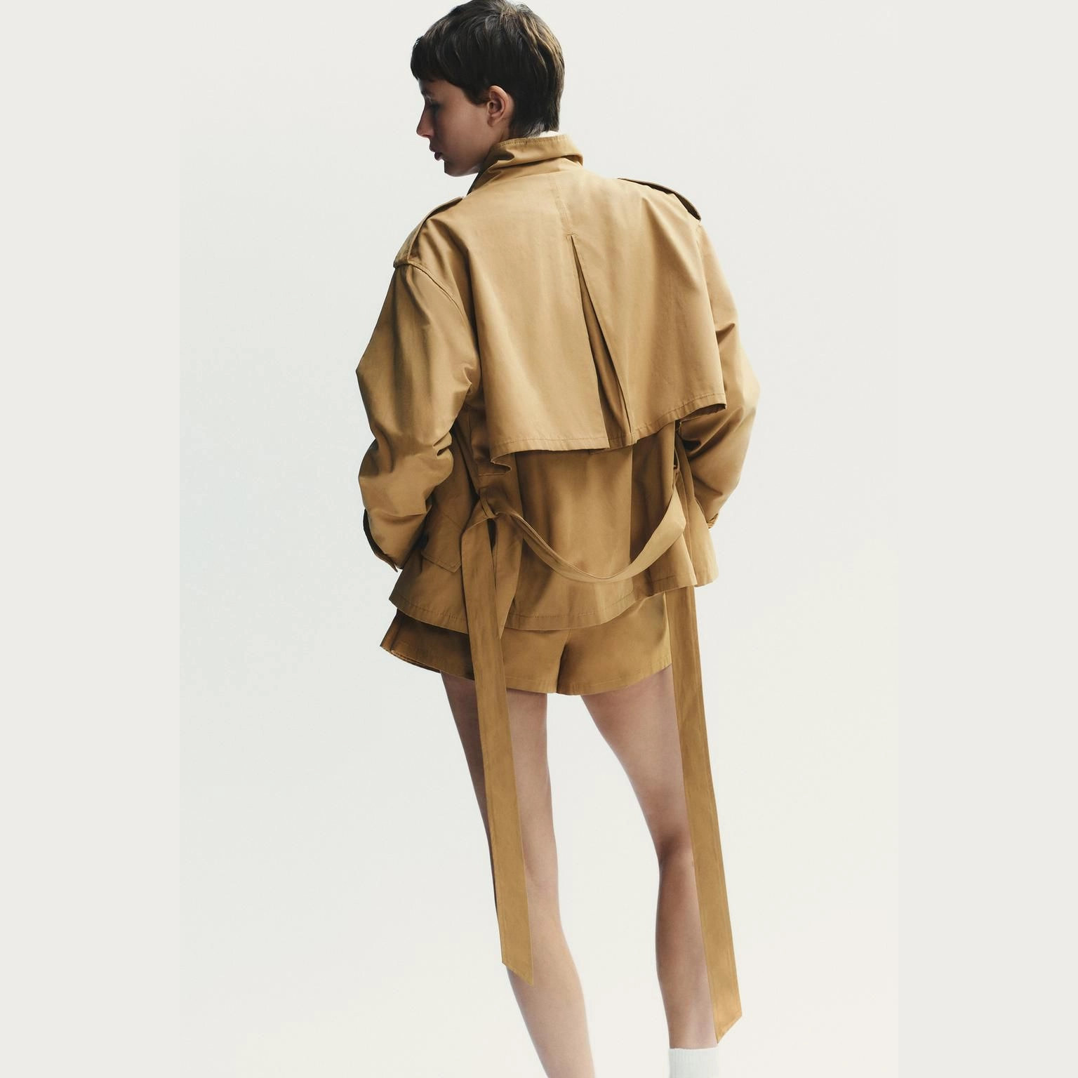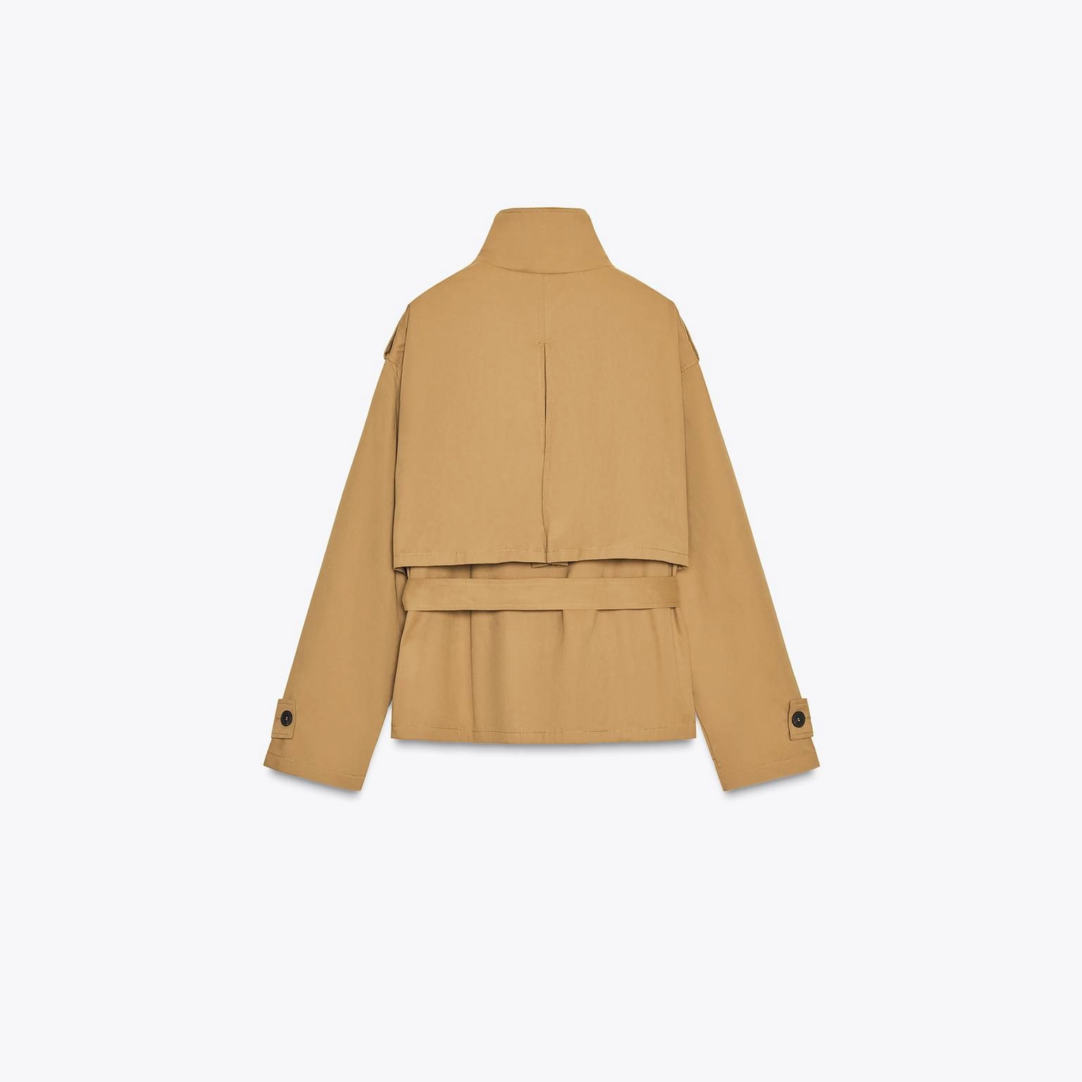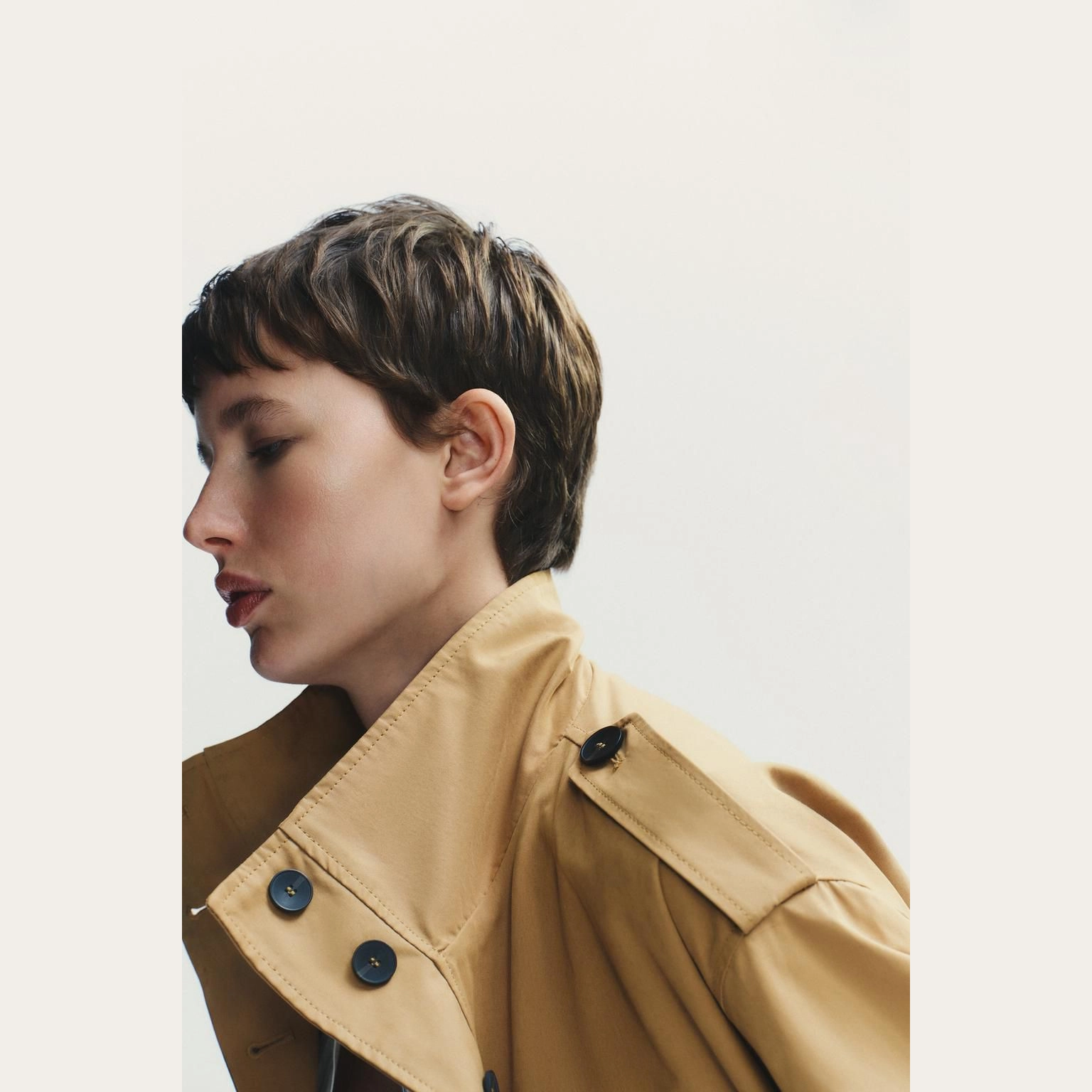 Short trench coat with a high collar. Long sleeves with tabs on the shoulders and sleeves. Lapel detail on the chest and pockets with flaps on the front. Tie belt in the same fabric. Inner lining. Front fastening with hidden buttons concealed by a placket.