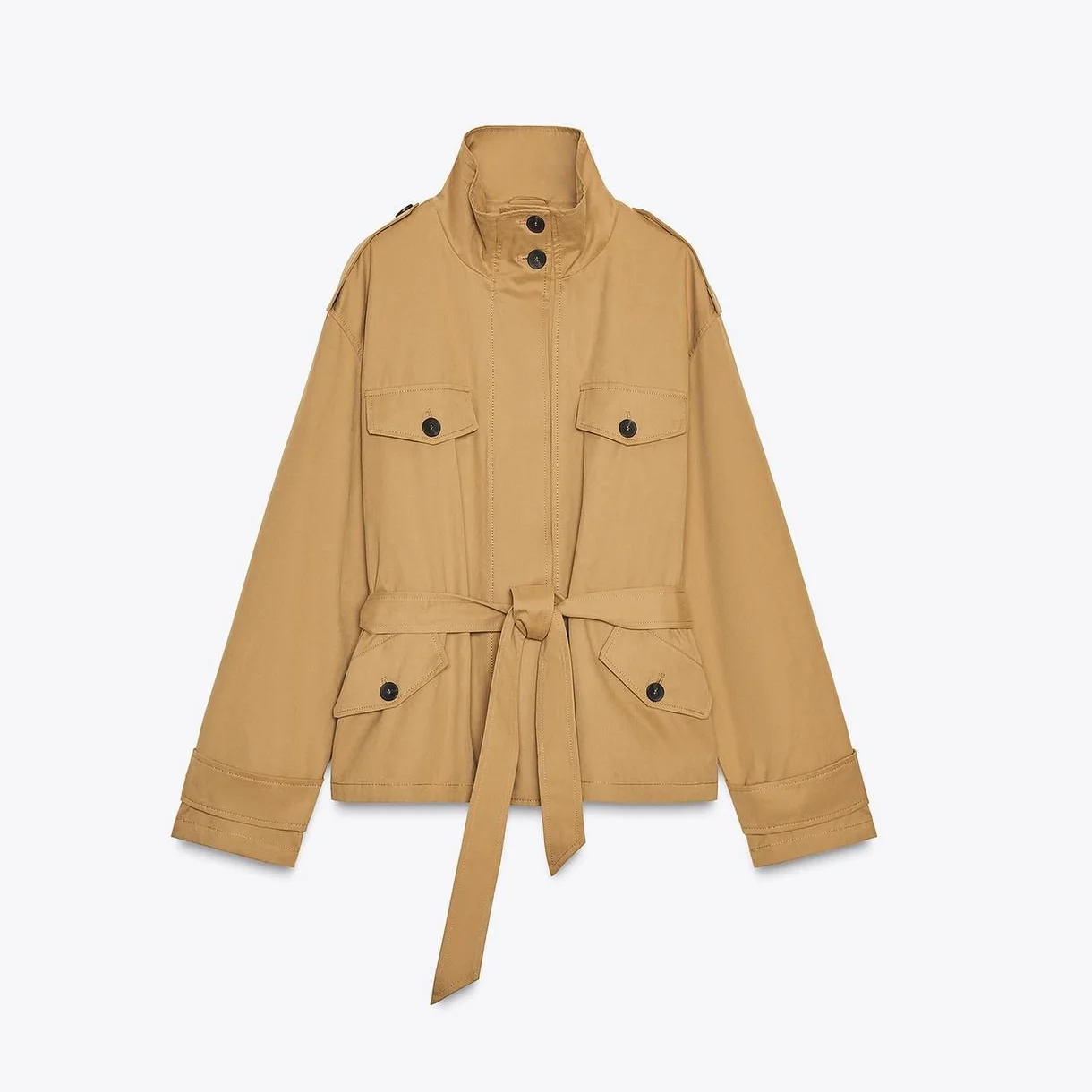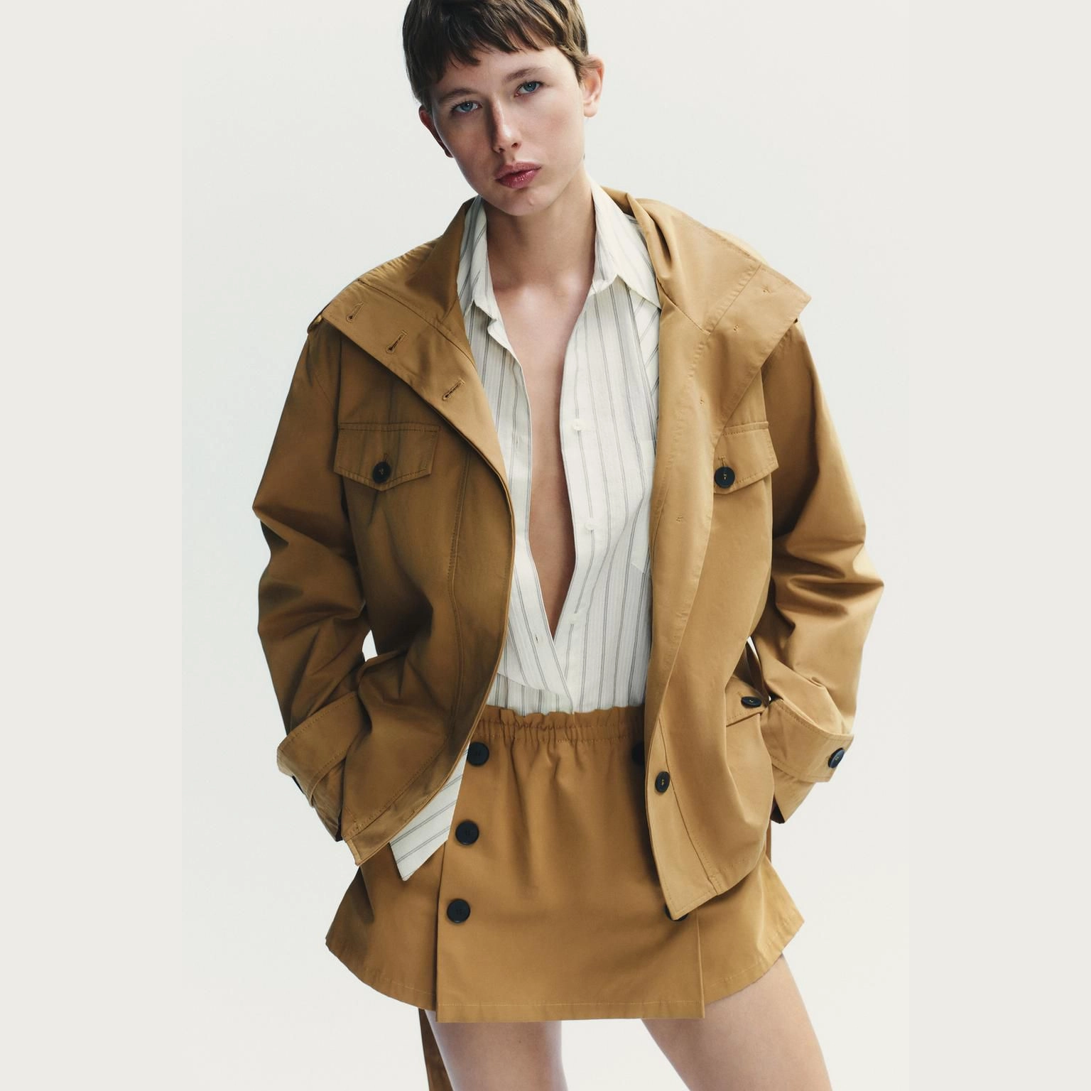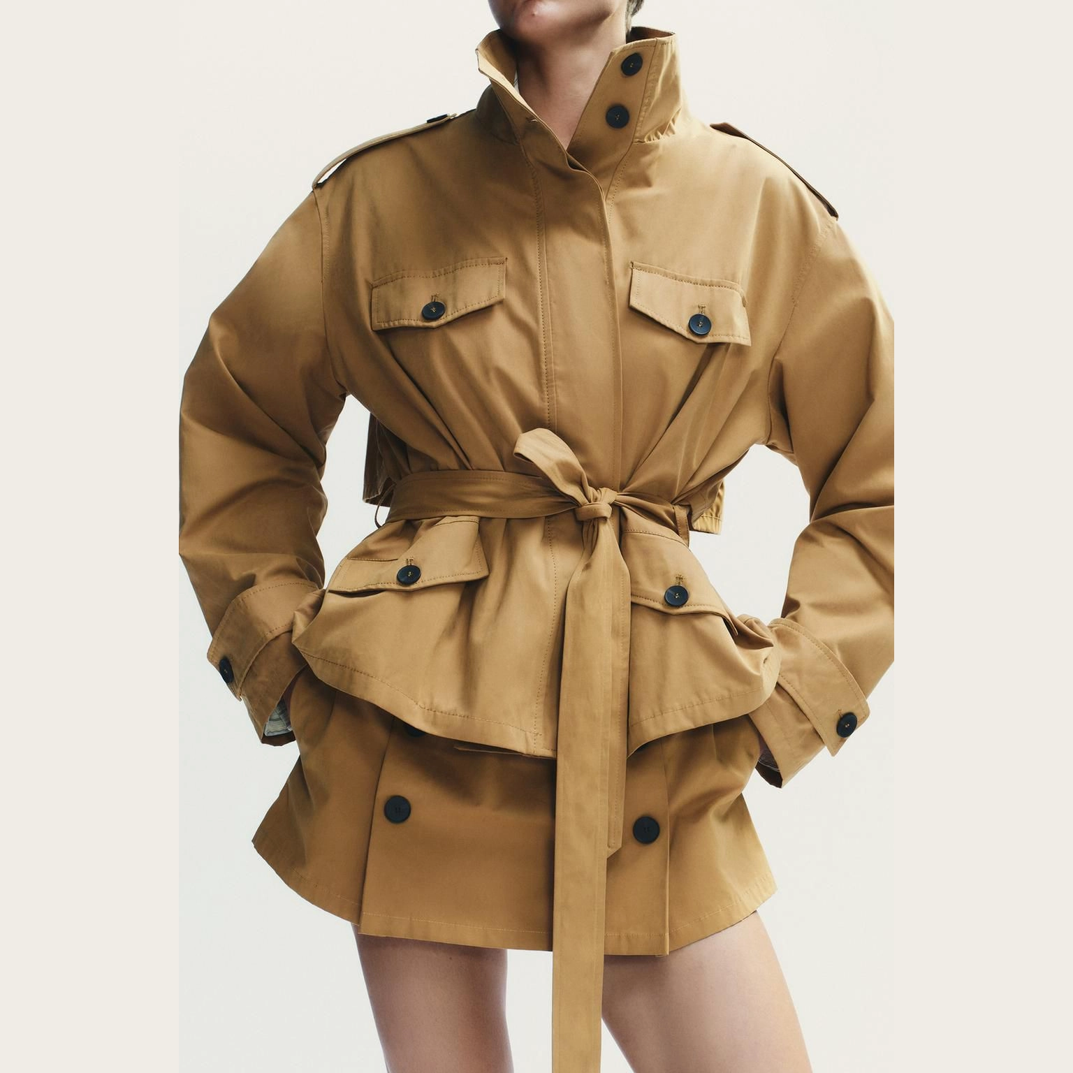 Short trench coat with a high collar. Long sleeves with tabs on the shoulders and sleeves. Lapel detail on the chest and pockets with flaps on the front. Tie belt in the same fabric. Inner lining. Front fastening with hidden buttons concealed by a placket.