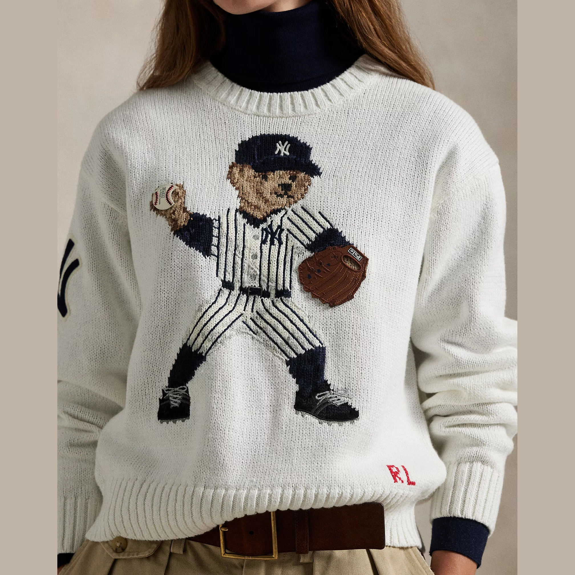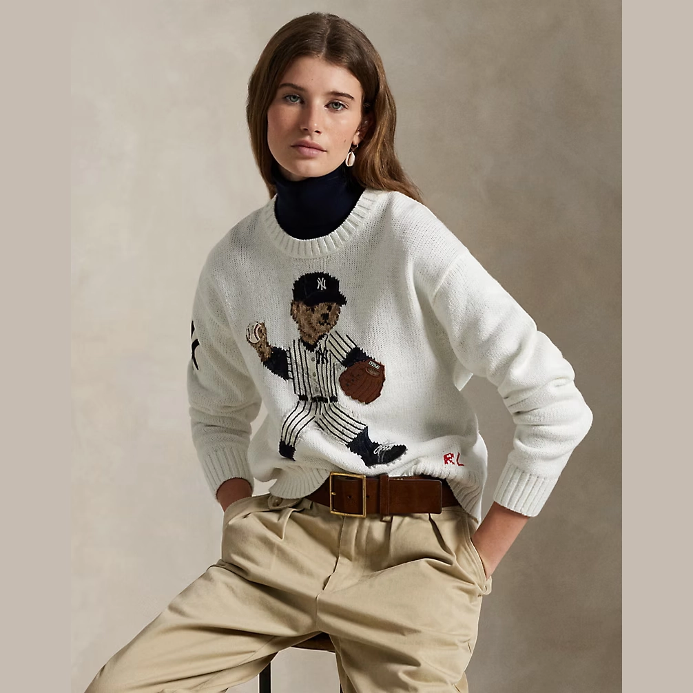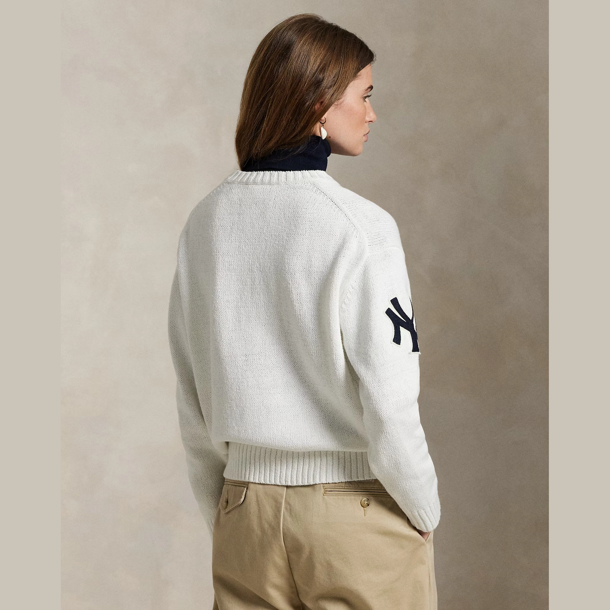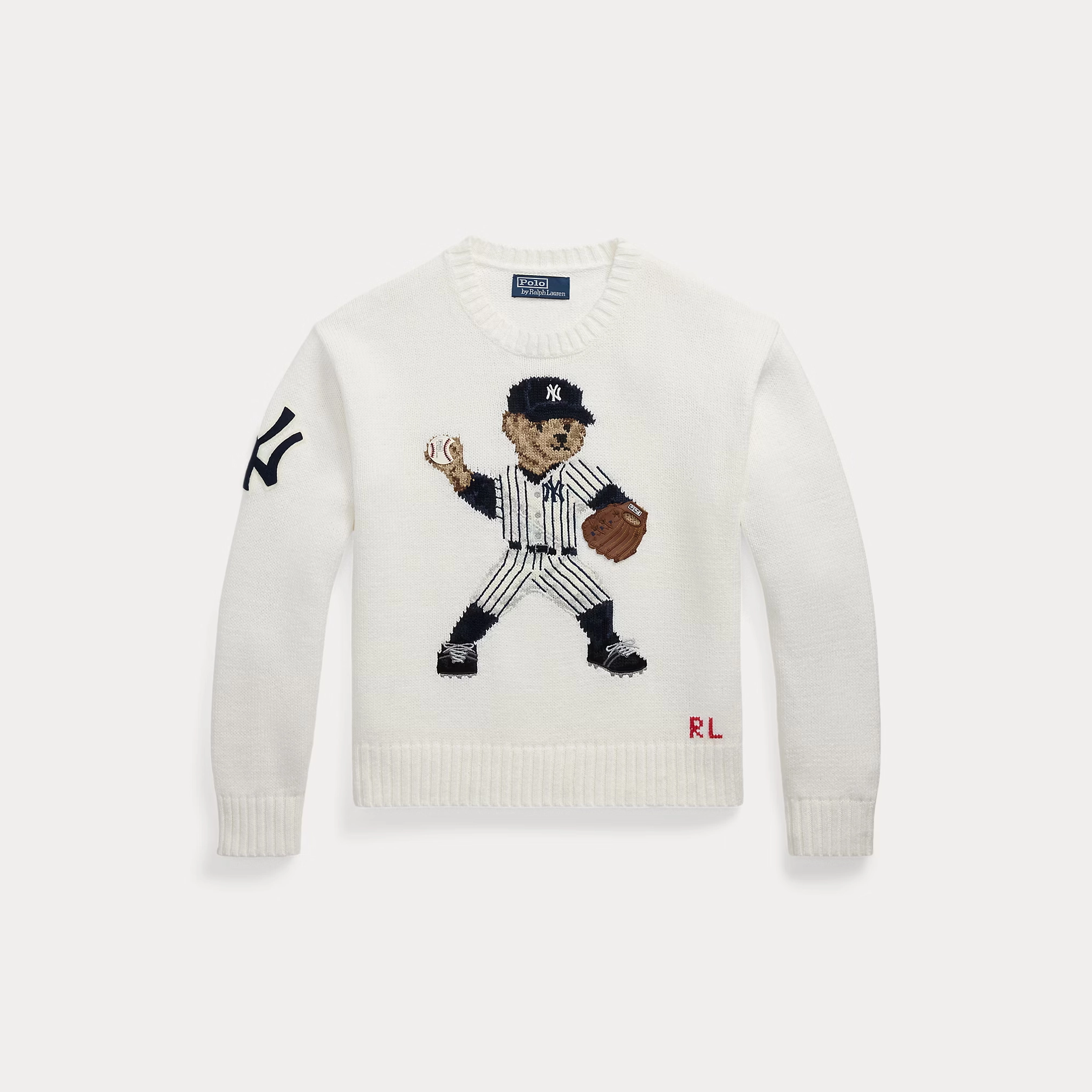 Polo Bear intarsia-knit and embroidered at the front. Faux-leather baseball and glove patches. “RL” cross-stitched at the left hem. New York Yankees™ logo patch embroidered at the right sleeve.