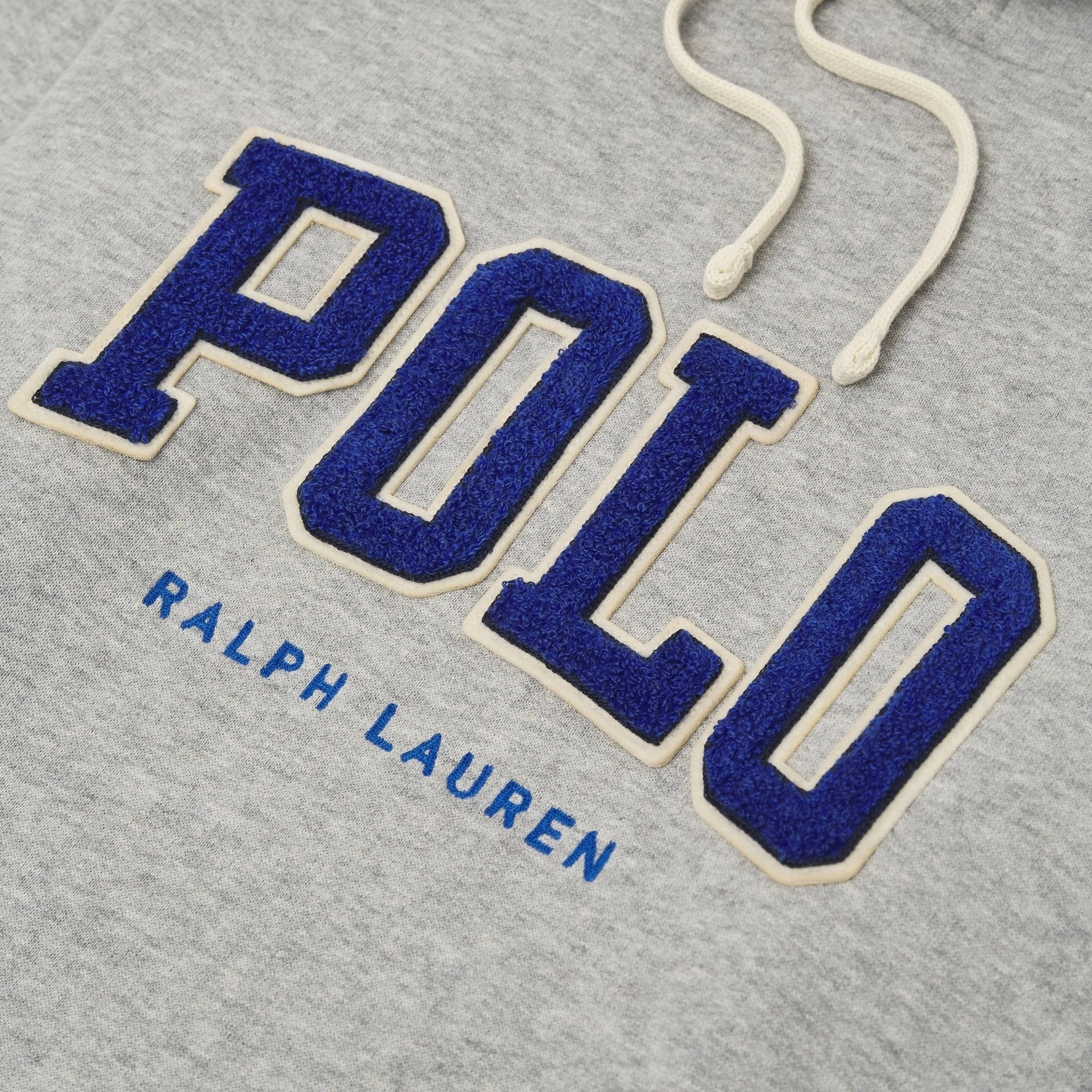 • Chenille patches spelling out “Polo” and chain-stitched “Ralph Lauren” embroidery at the center front. Kangaroo pocket.