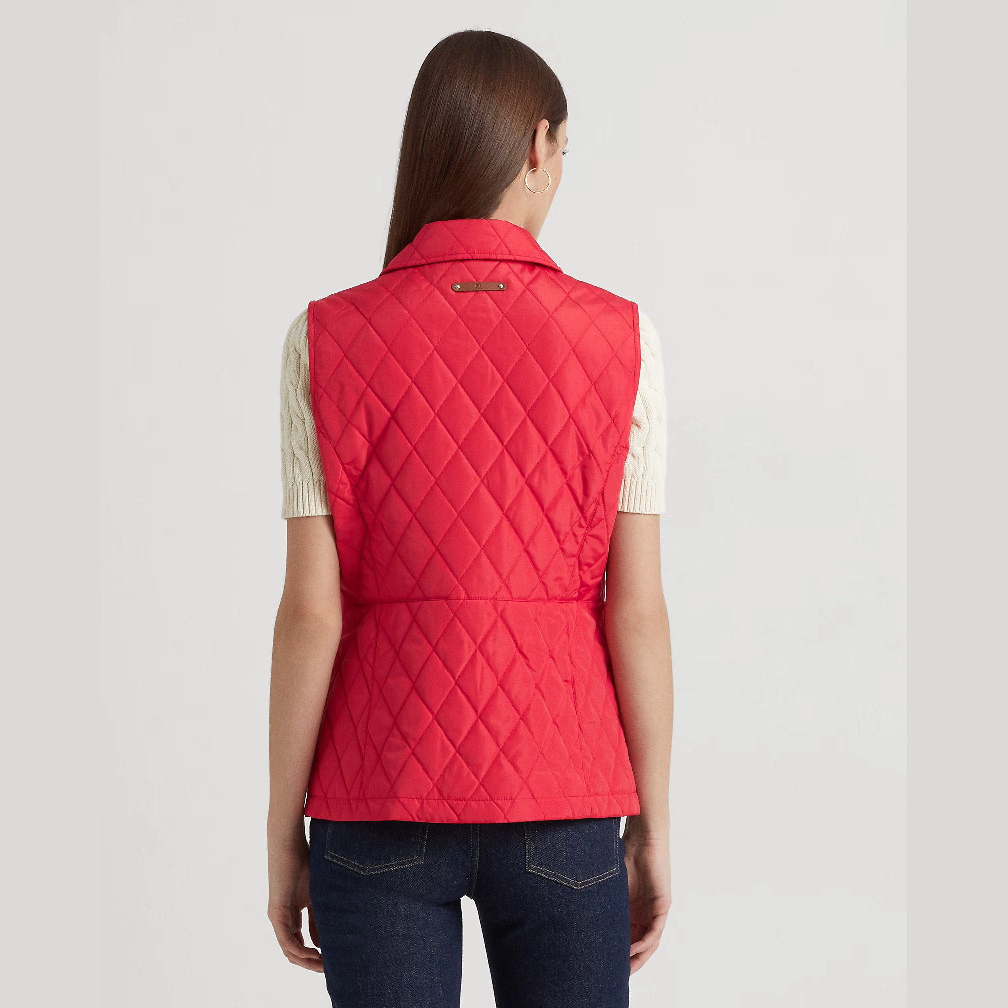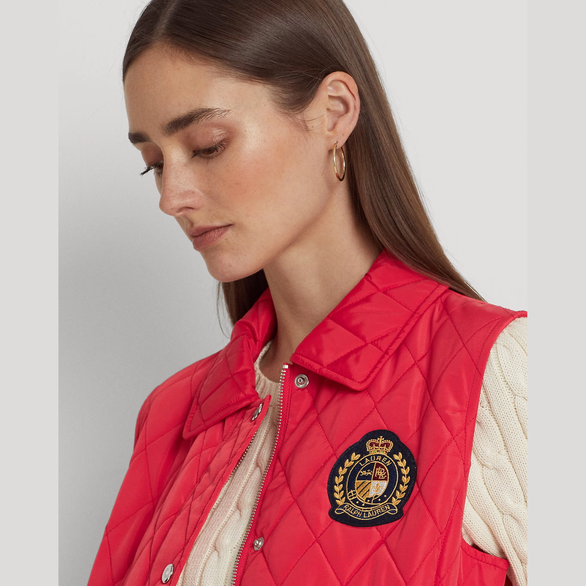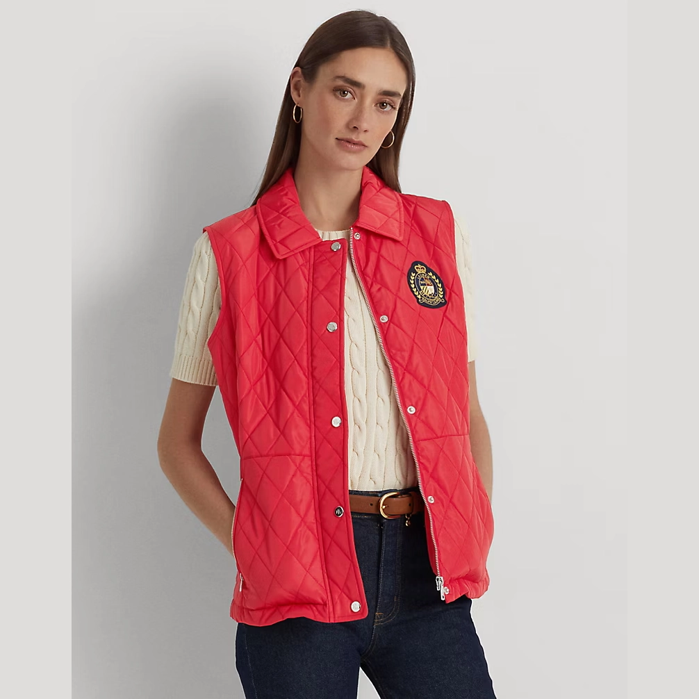 • Sleeveless silhouette. Two front waist zip pockets. Signature crest patch on the left chest. Front and back princess seams. Fully lined and lightly filled.