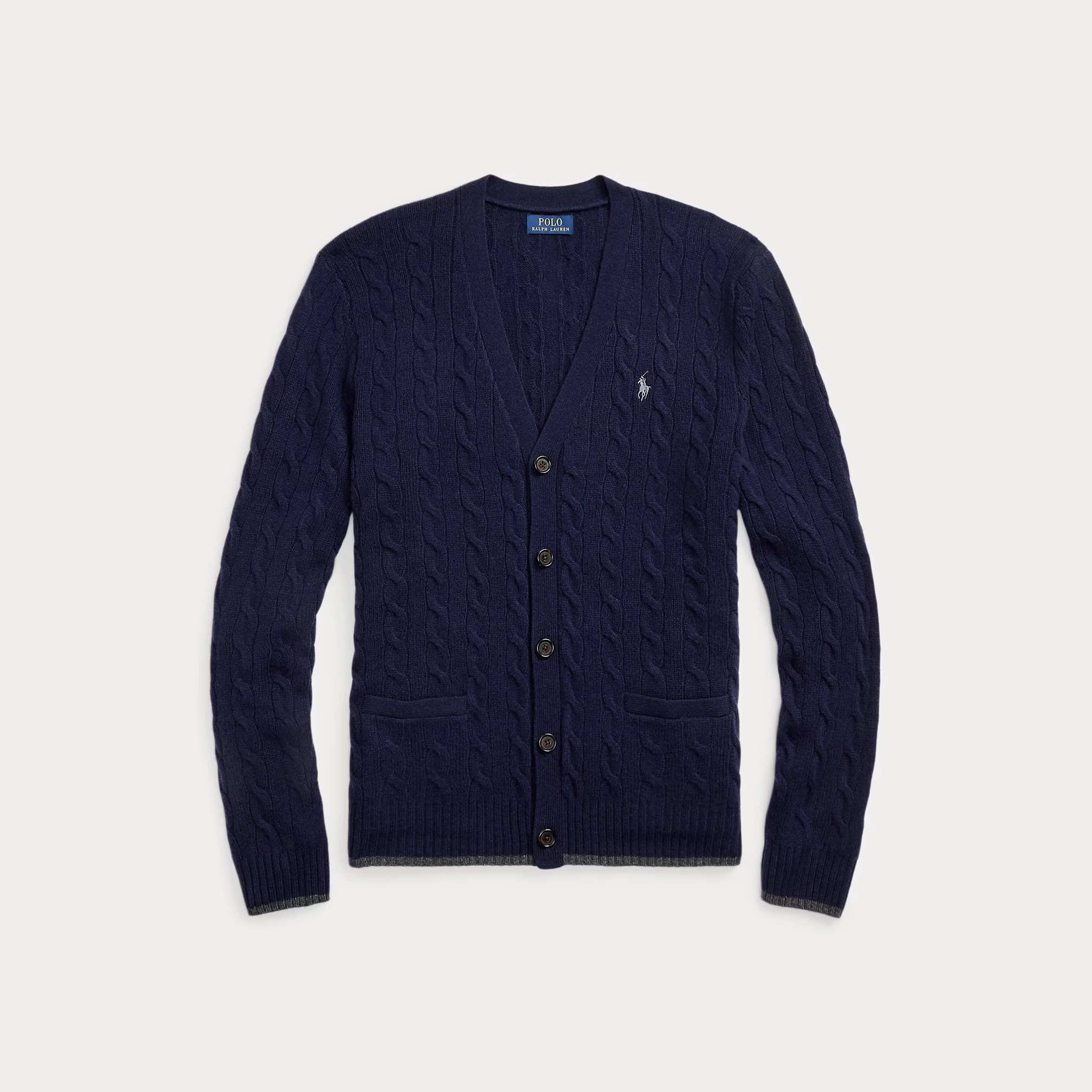 • V-Neck. Five-button placket. Long sleeves with rib-knit cuffs.