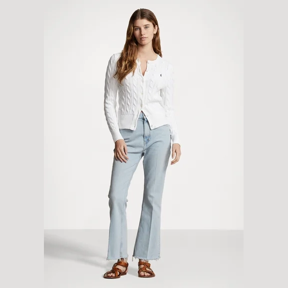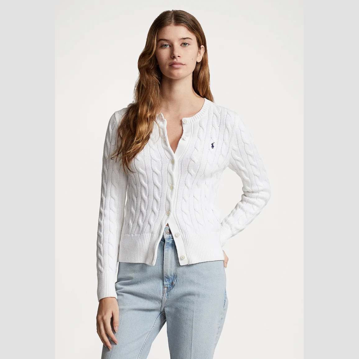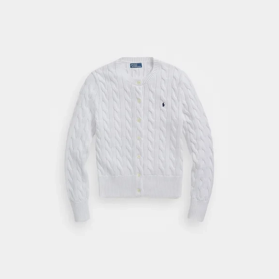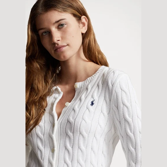 • Rib-knit crewneck. Buttoned placket with grosgrain trim.