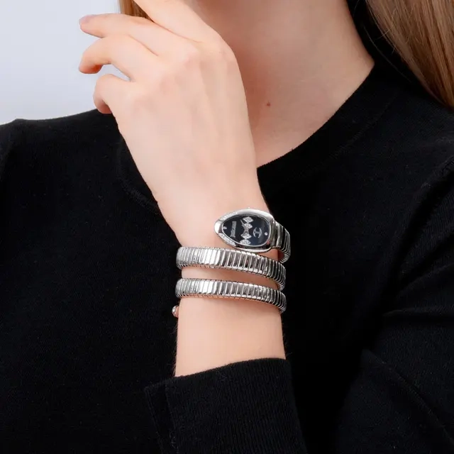 • Luxurious and elegant design in silver color with a blue dial and snake-shaped appearance.
