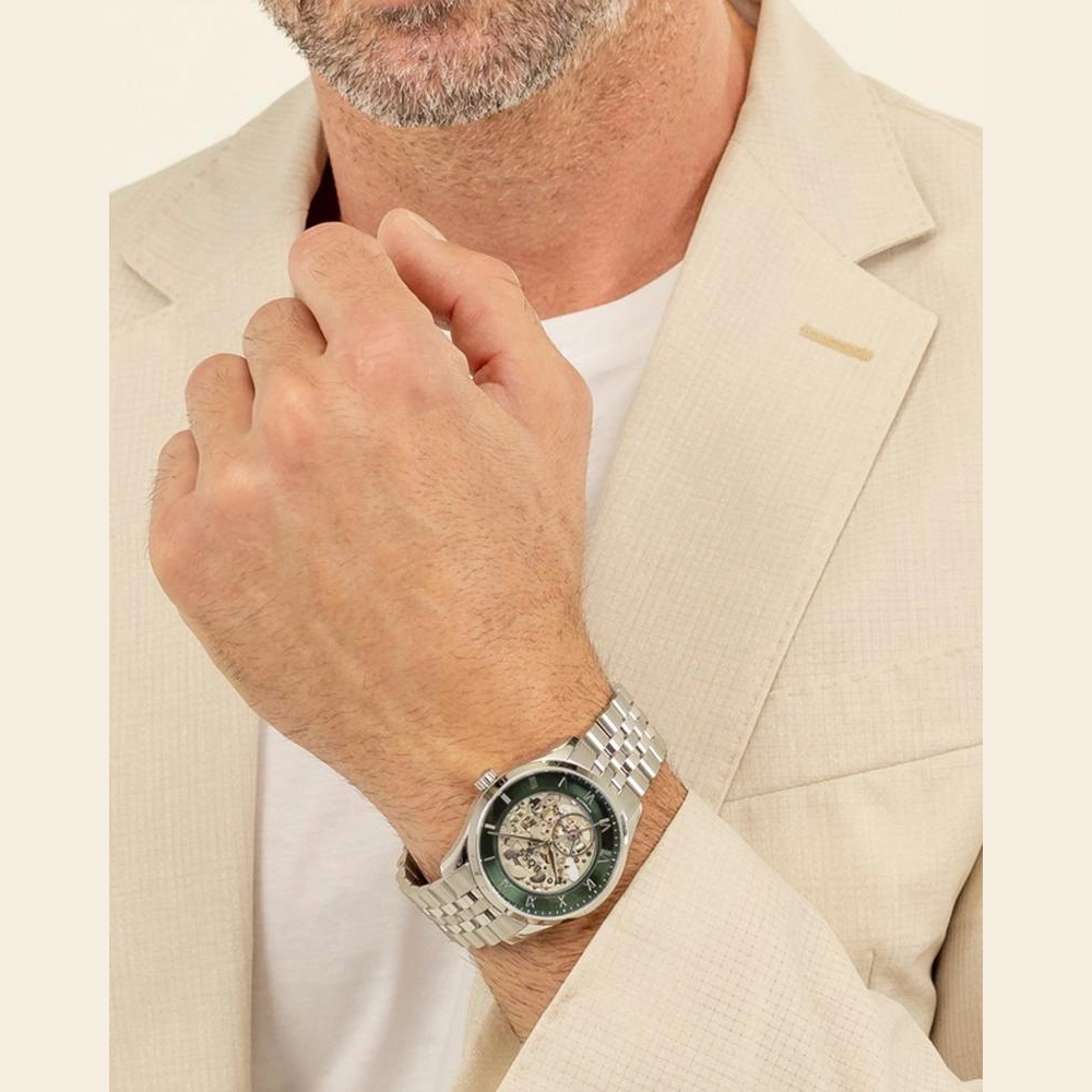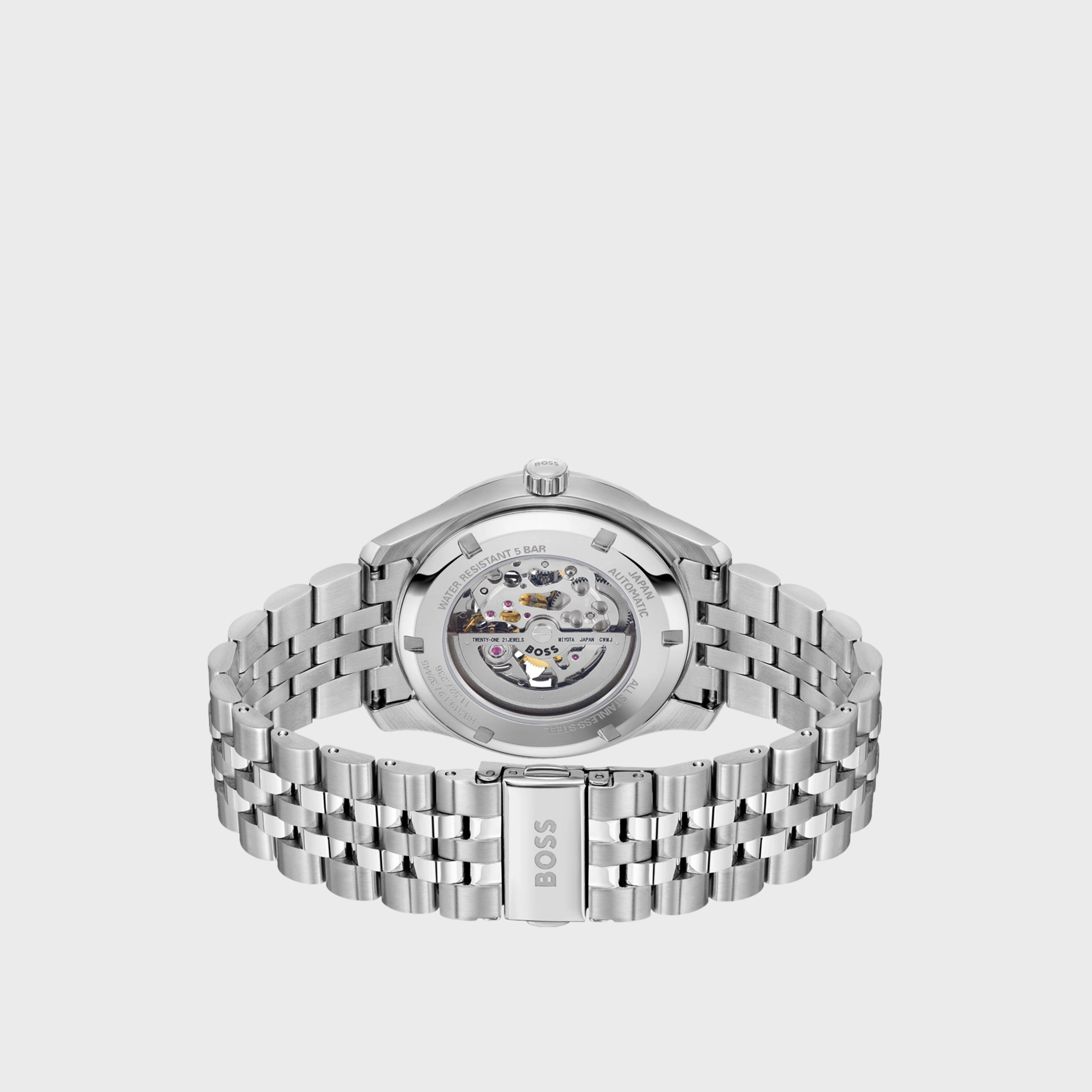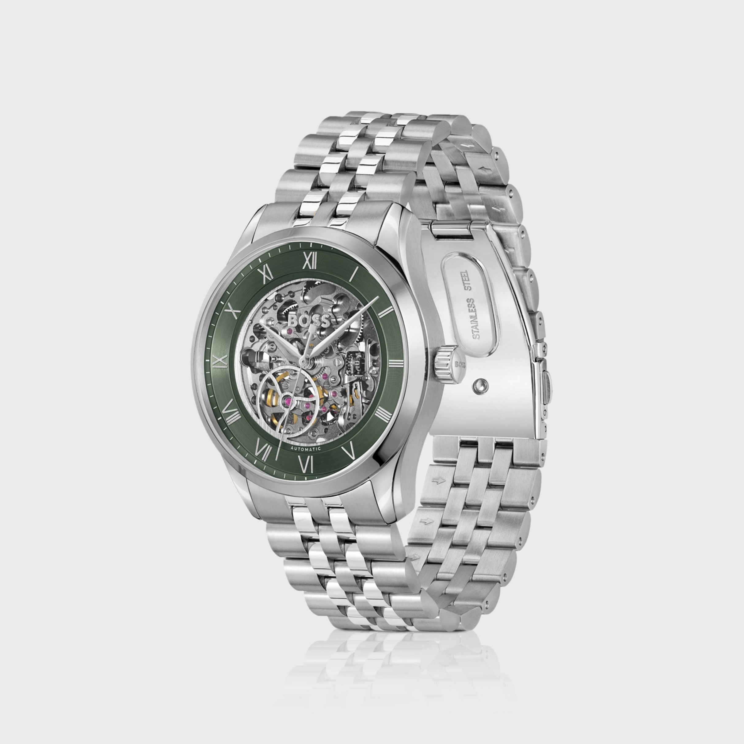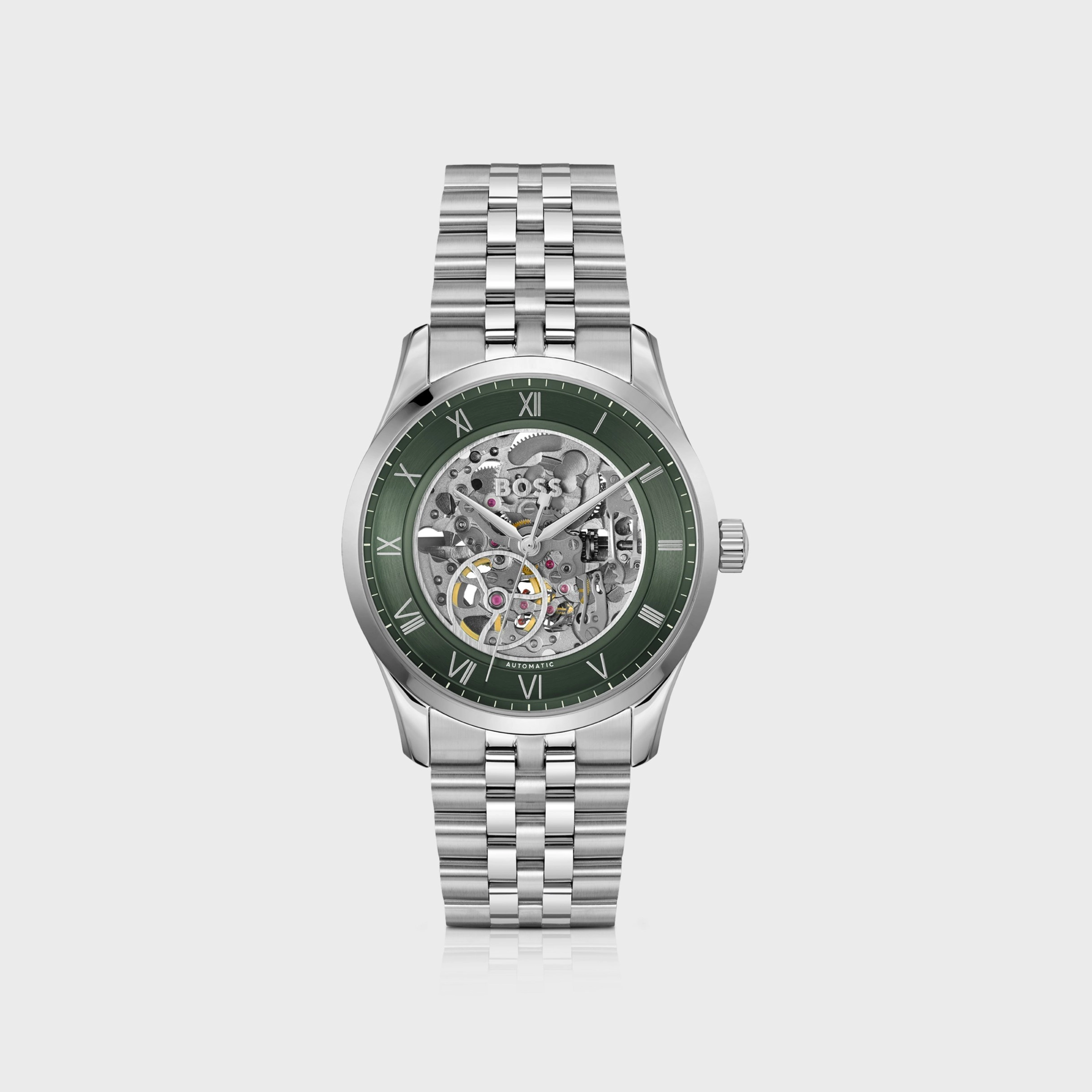 Original Hugo Boss  Mens Principle Skeleton Silver Stainless Steel Automatic Green Dial Silver Stainless Steel Bracelet Watch 1514236