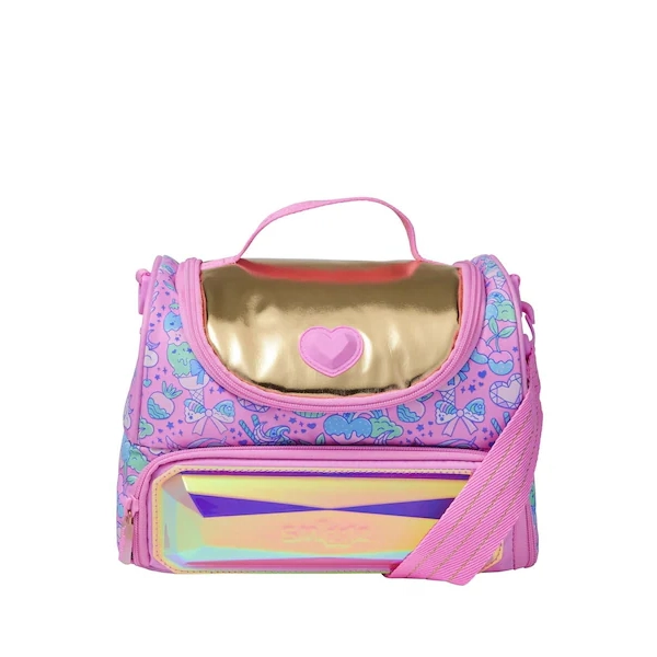 Get ready to shine with the Smiggle Radiant collection! Featuring stunning iridescent and metallic material. Plus, take a look at the stunning print featuring all kinds of magical details like flying unicorns, tasty treats and dazzling gems. Take lunchtime style to the next level with the Radiant Large Double Lunchbox With Strap! This lunchbox comes with all the classic features of Smiggle’s Double Lunchbox but with extra space and a handy carry strap. The bottom compartment perfectly fits Smiggle’s Large Bento Lunchbox, plus it has a padded heart-diamond applique, solid 3-D diamond front pocket and magical print! BPA free and food grade safe lining. Insulated & easy to wipe lining. Keeps your. lunch cool 2 compartments, top compartment with double zip. Adjustable and removable shoulder strap. Carry handle. Name label 6.5L.