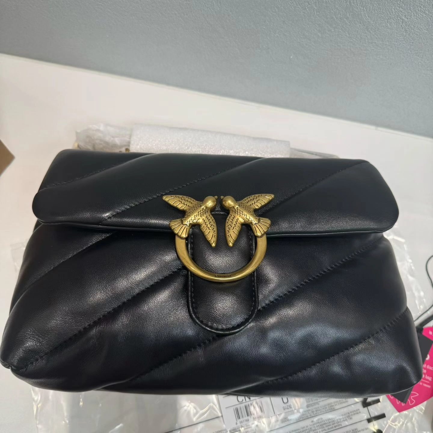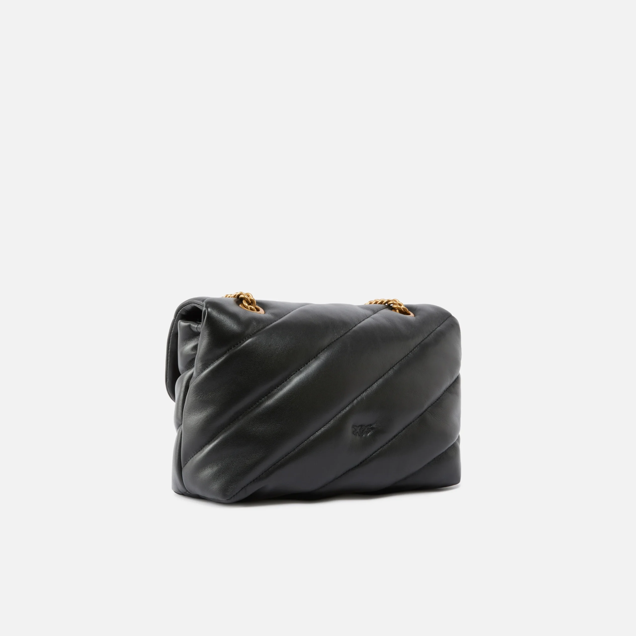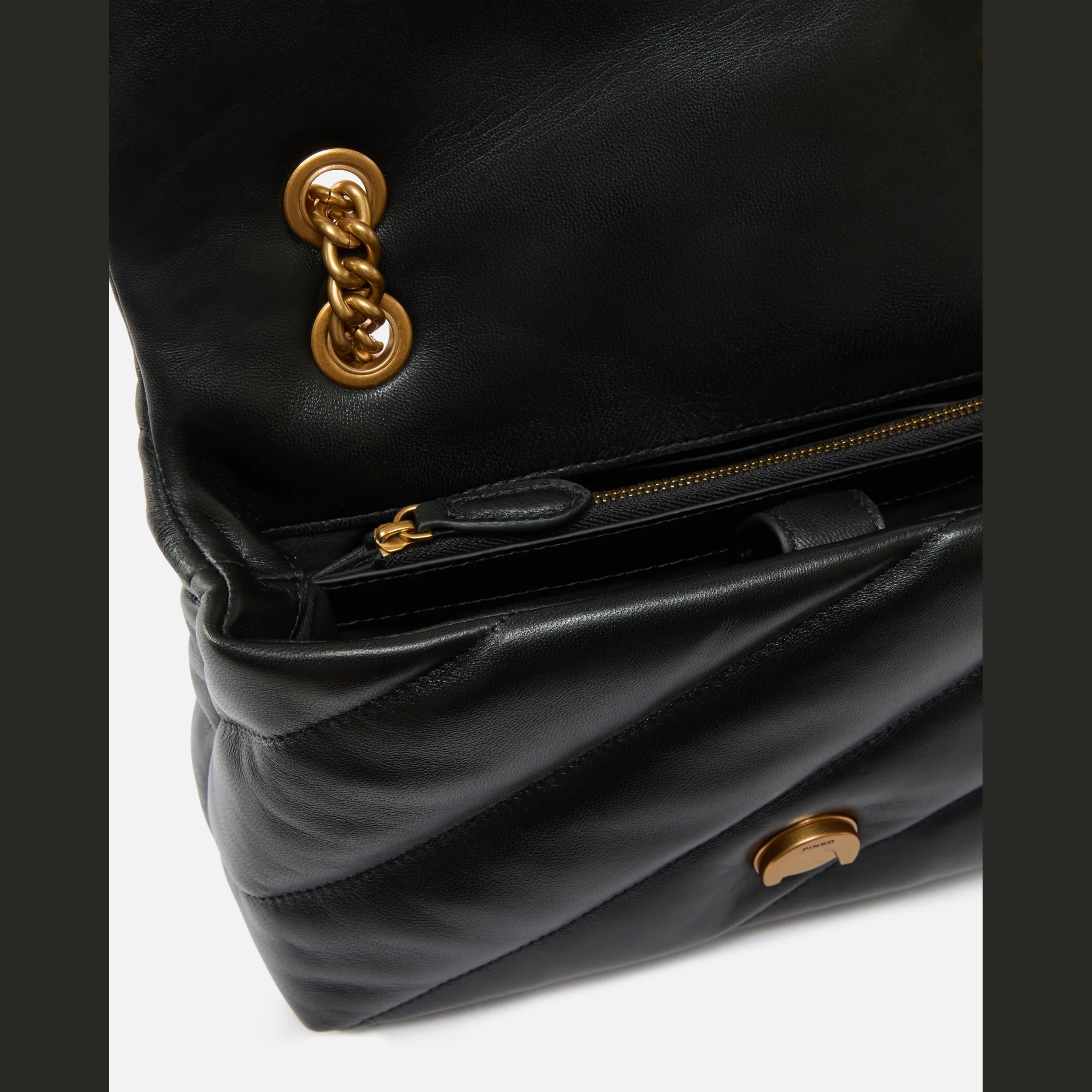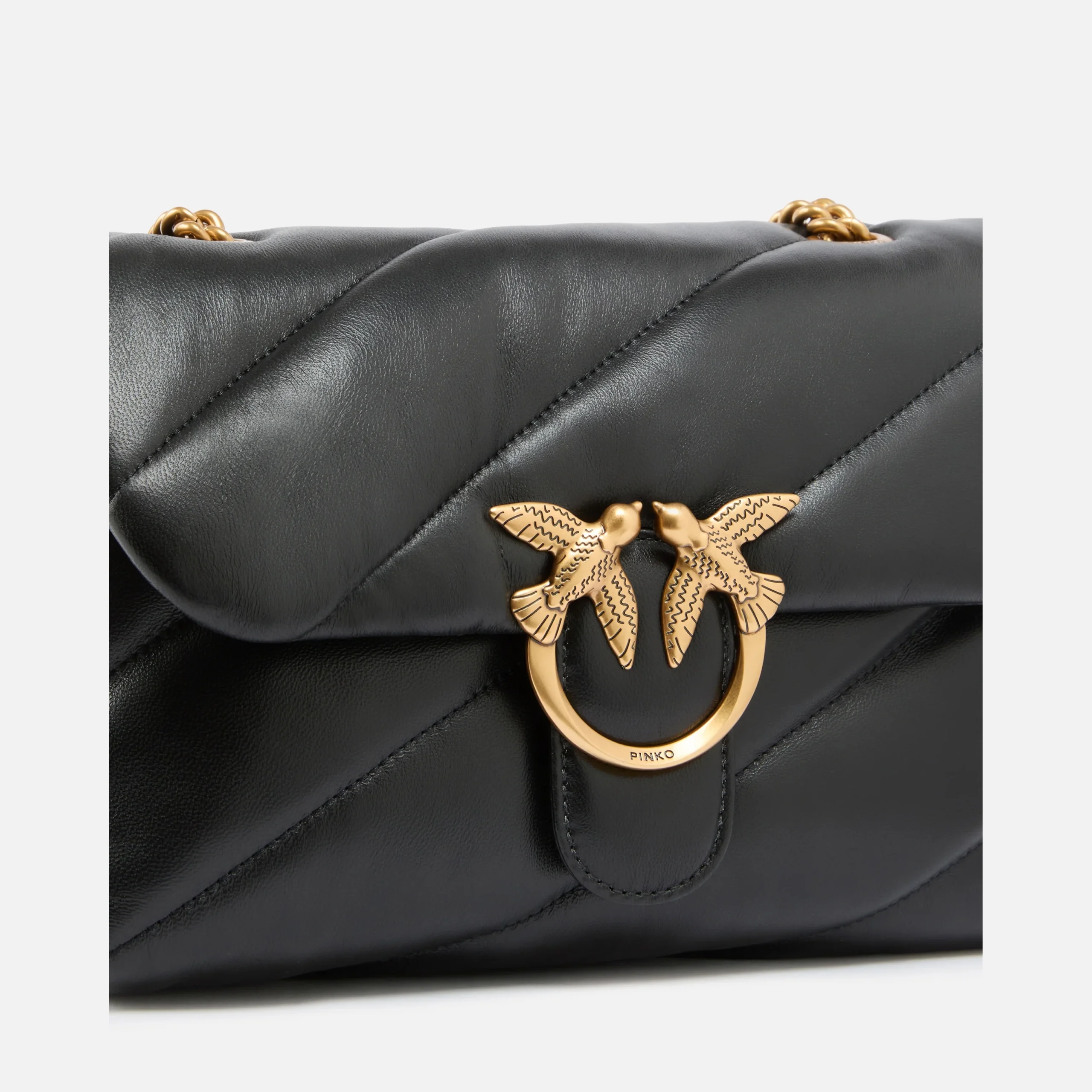 Classic Love Bag Puff in soft nappa leather featuring maxi slanted quilting. The fastening is embellished with the iconic metal Love Birds Diamond Cut buckle. The accessory boasts a microsuede-lined interior, complete with a zipped centre divider pocket and slip pocket. The shoulder strap combines the classic round metal chain with a practical nappa leather shoulder pad.