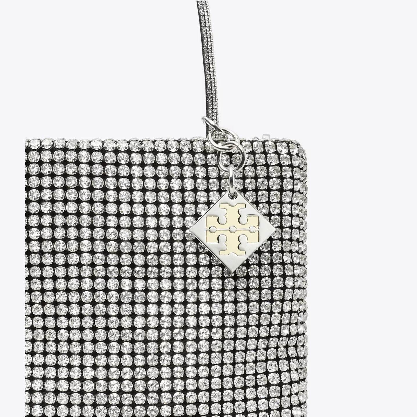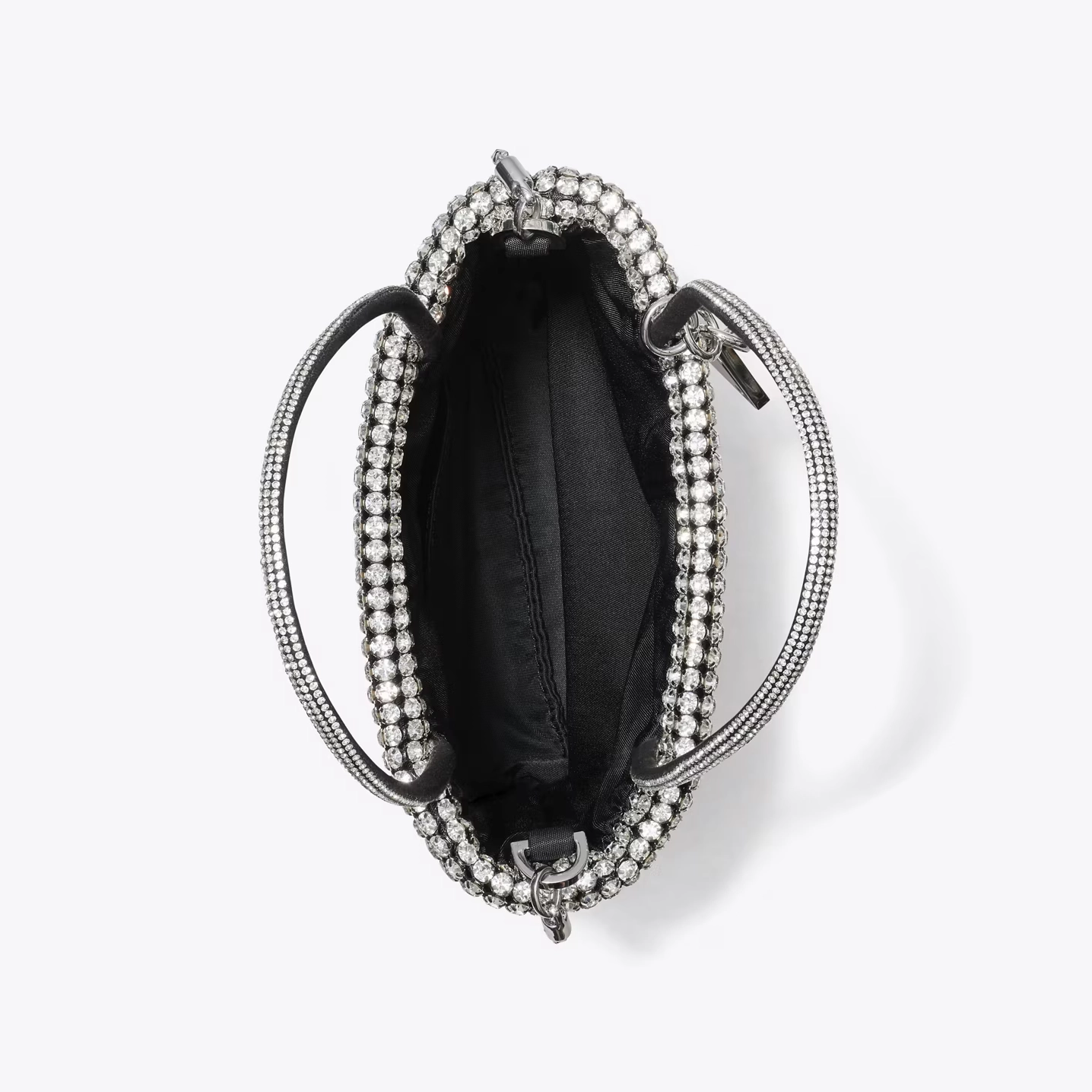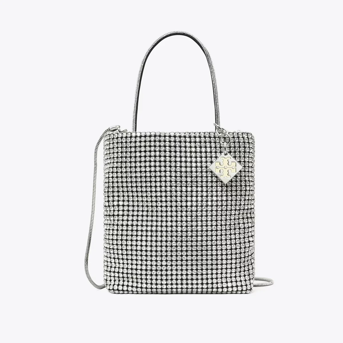 Pavé embellishment elevates the new mini tote for evening. Carry it by the top handle or wear crossbody with the slim chain strap.