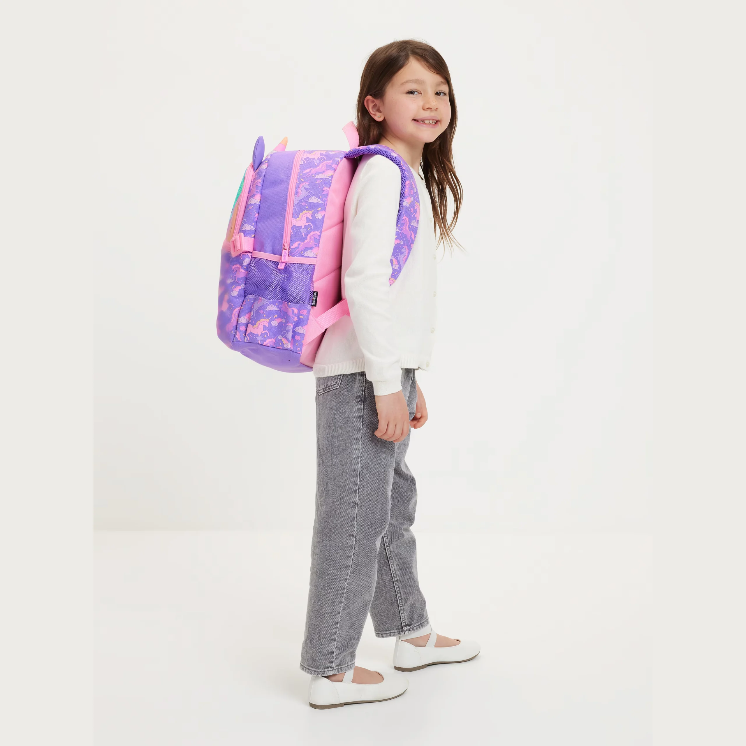 Feel ready to take on new adventures with our Eclipse Classic Attach Backpack! It has three zipped compartments to stash your stationery, tech, snacks and more! Plus dual drink bottle sleeves and padded adjustable shoulder straps. It also has handy side clips that attach to our Eclipse Oblong Attach Lunchbox for super easy lunch storage. Check out the extra design details including character zips, a silicone badge and graphic print!