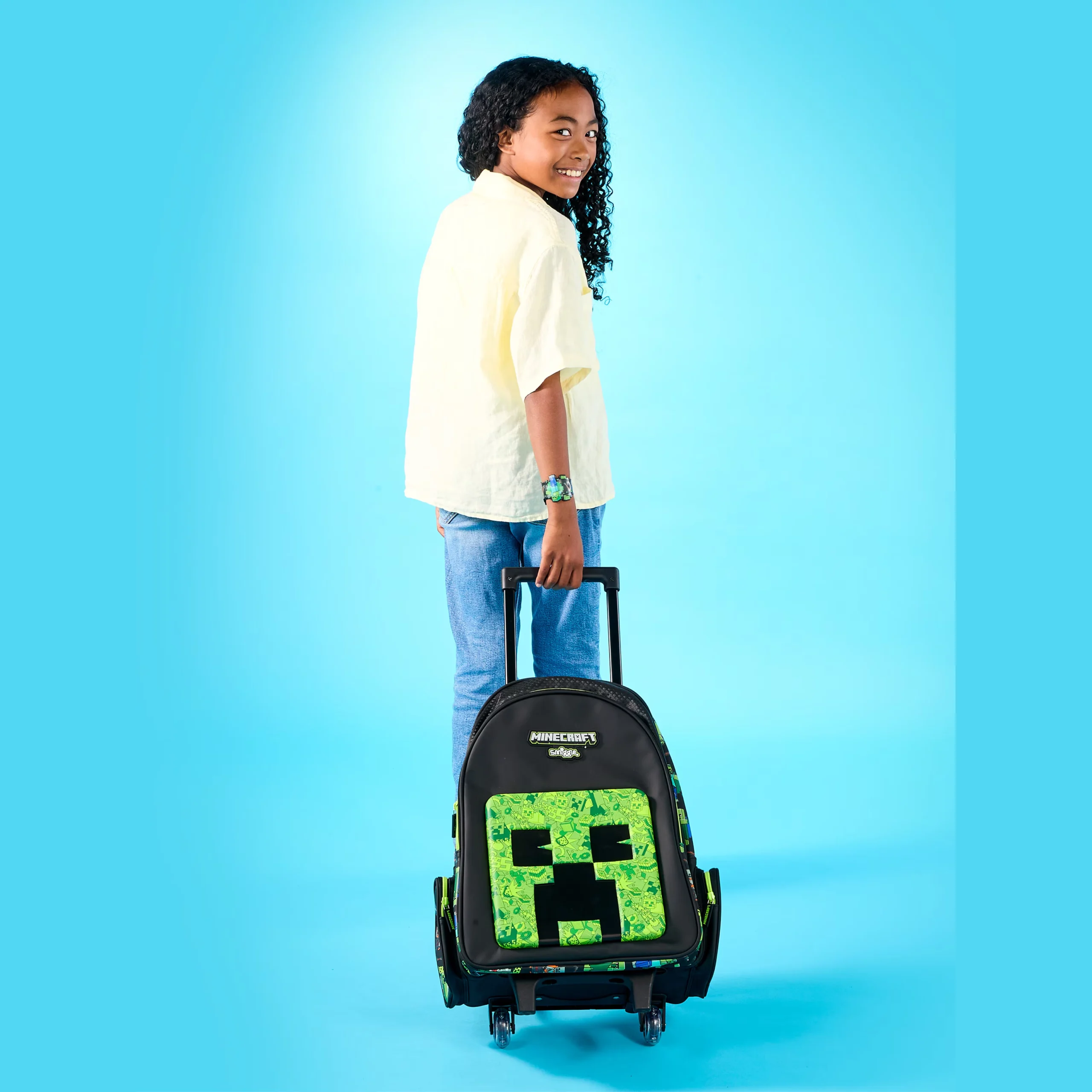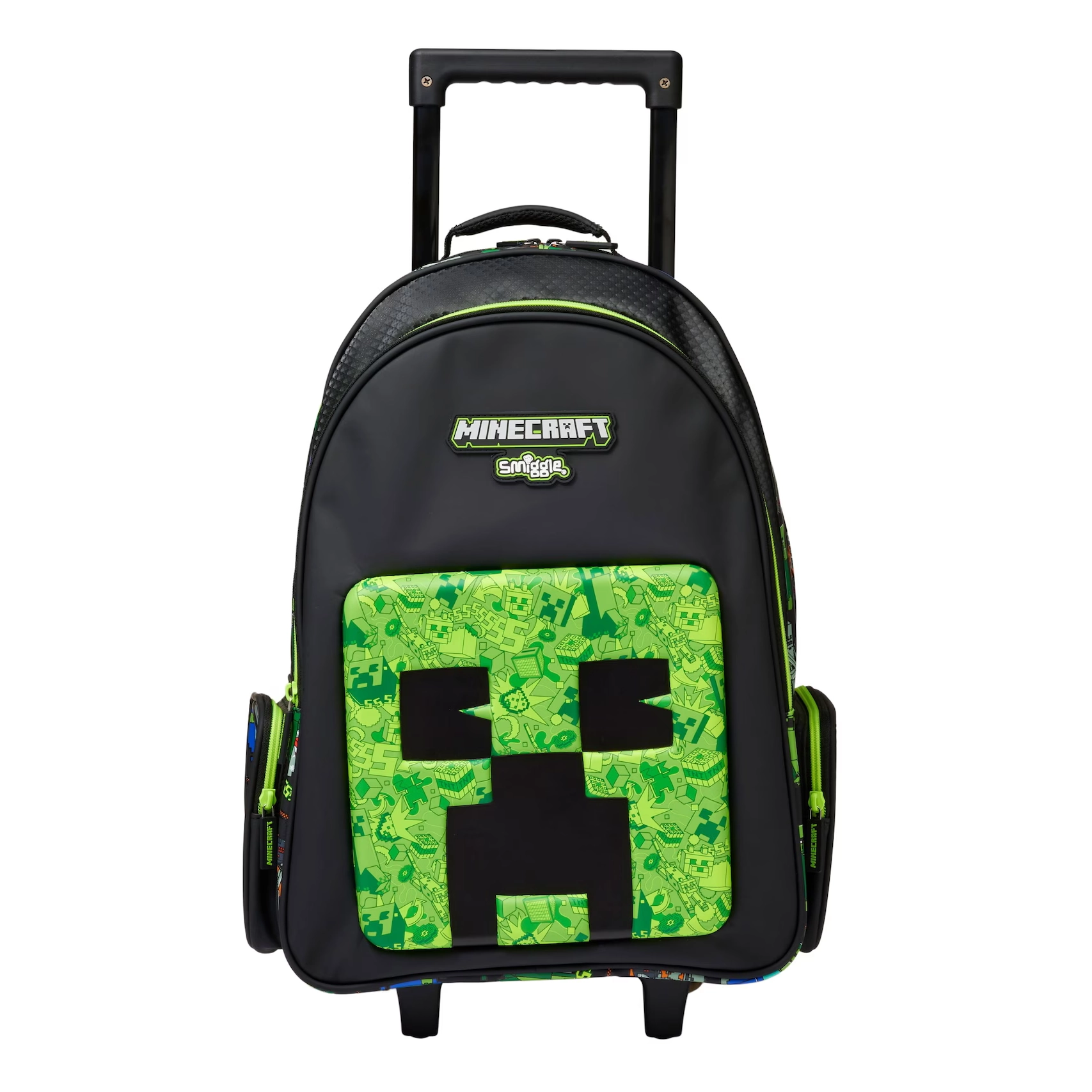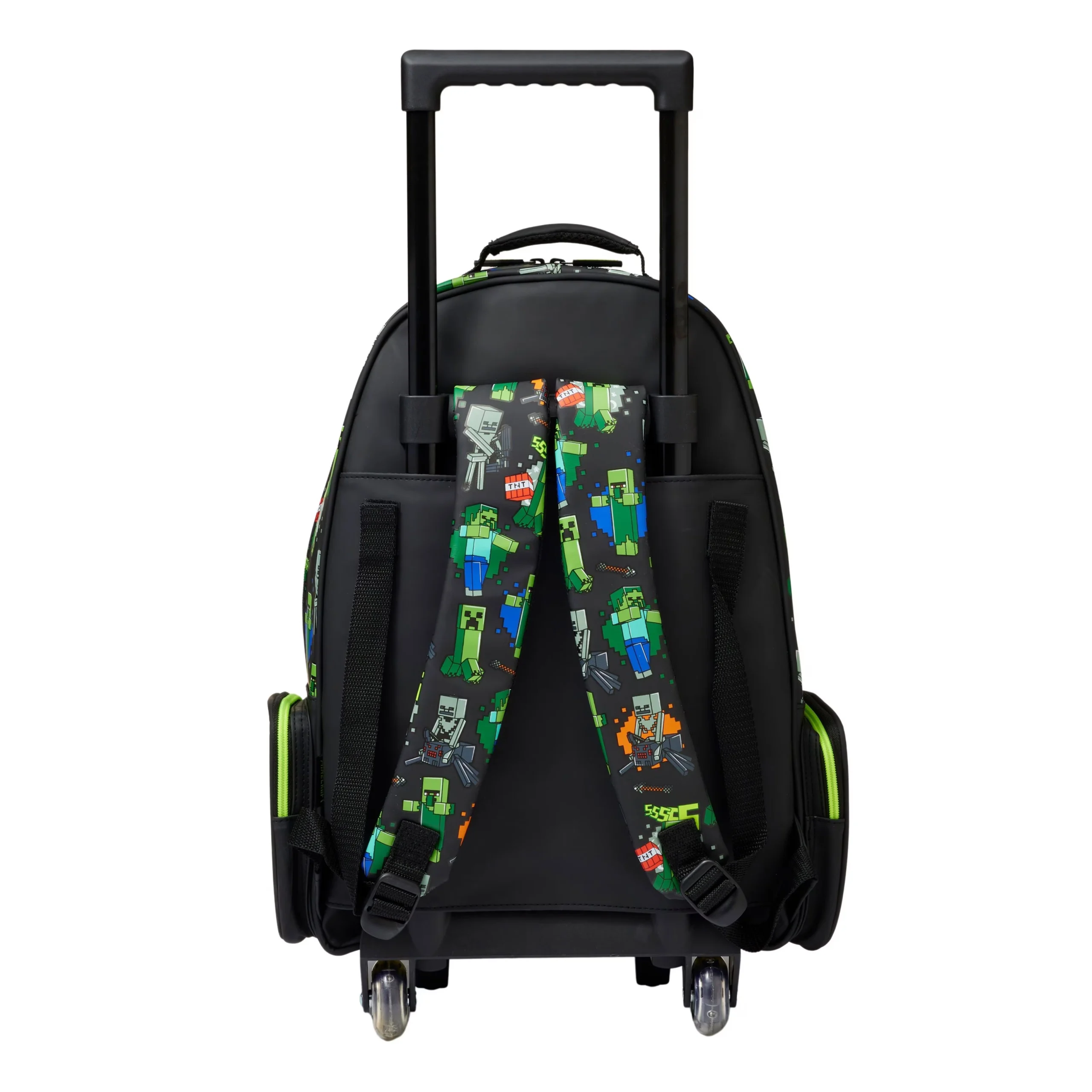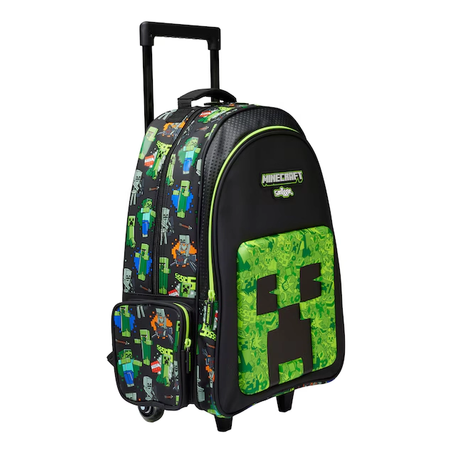 Keep all inventory safe while running from Creepers with our Minecraft Trolley Backpack. Features an embossed Creeper front pocket to store all grab and go essentials while escaping hostile mobs, three spacious zipped compartments for larger tools and dual drink bottle sleeves to stay hydrated! Check out the awesome character print filled with iconic elements from the game and the motion activated light up wheels! Plus the fun does not stop there – Watch as it easily converts from a wheelie bag to a backpack!