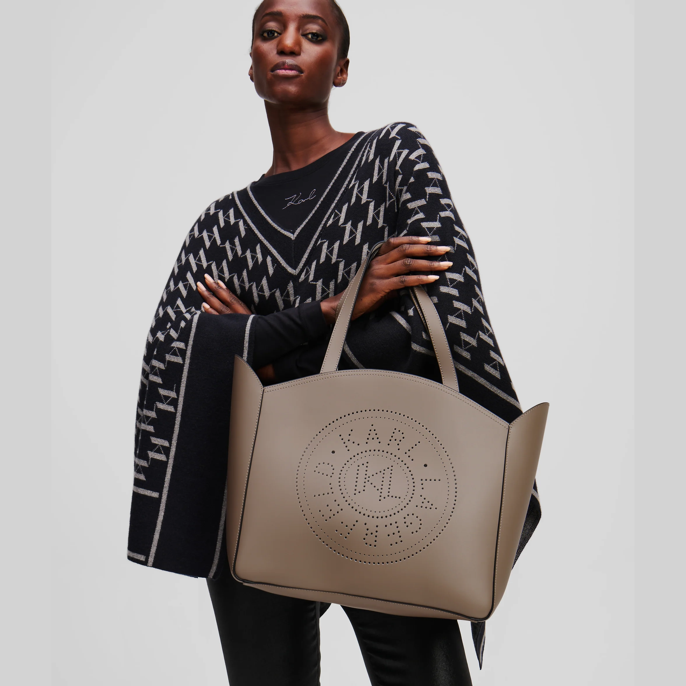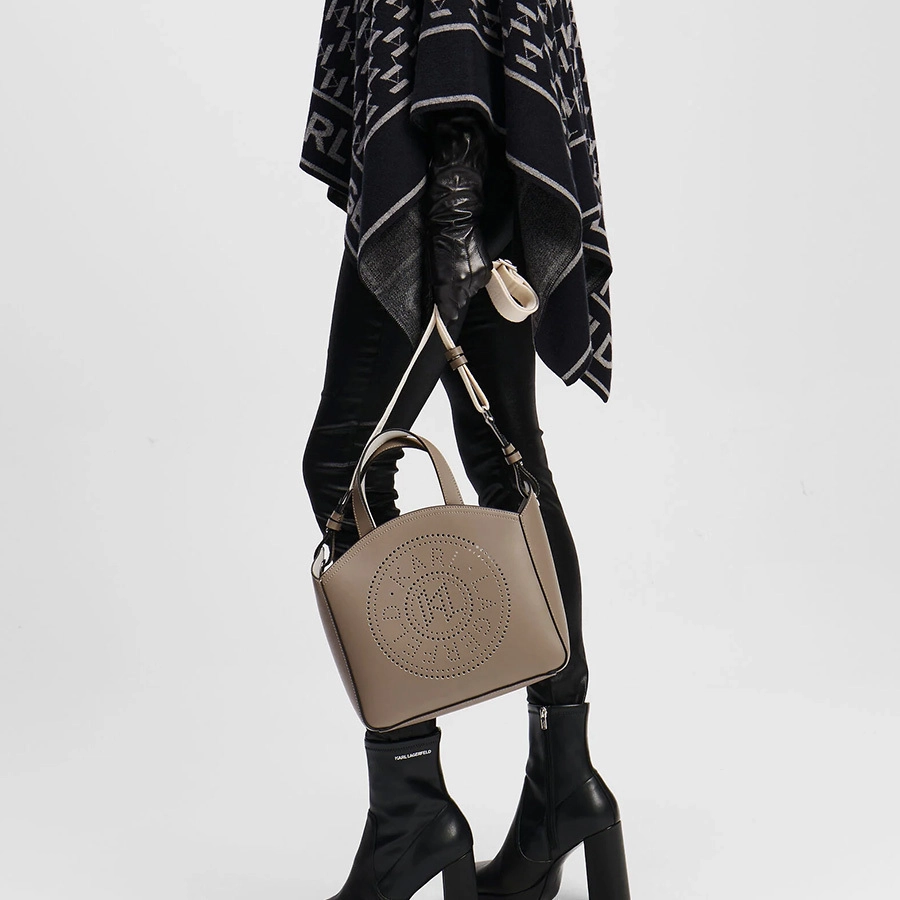 Small leather tote bag, with a handle and detachable strap. It features a perforated design with the logo.