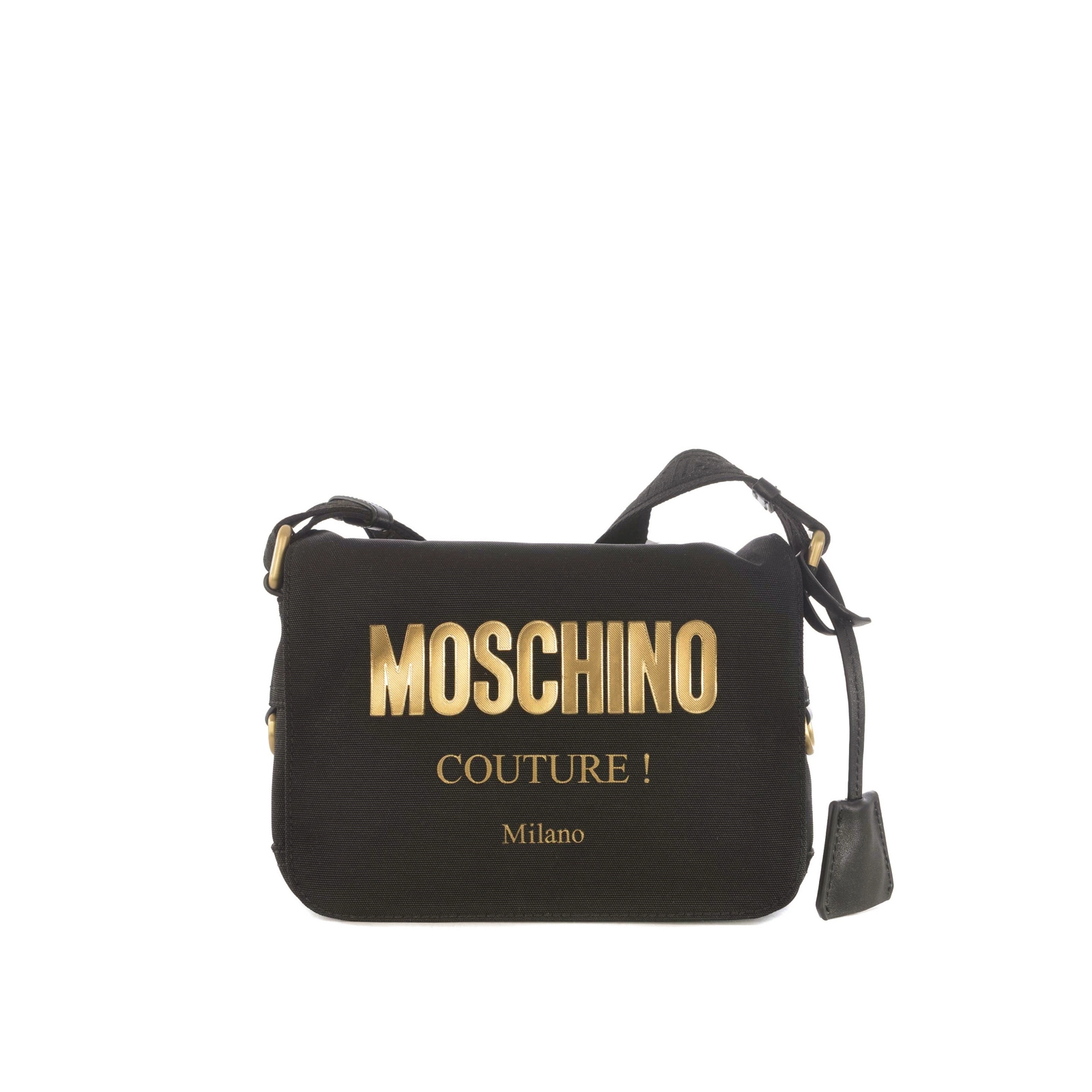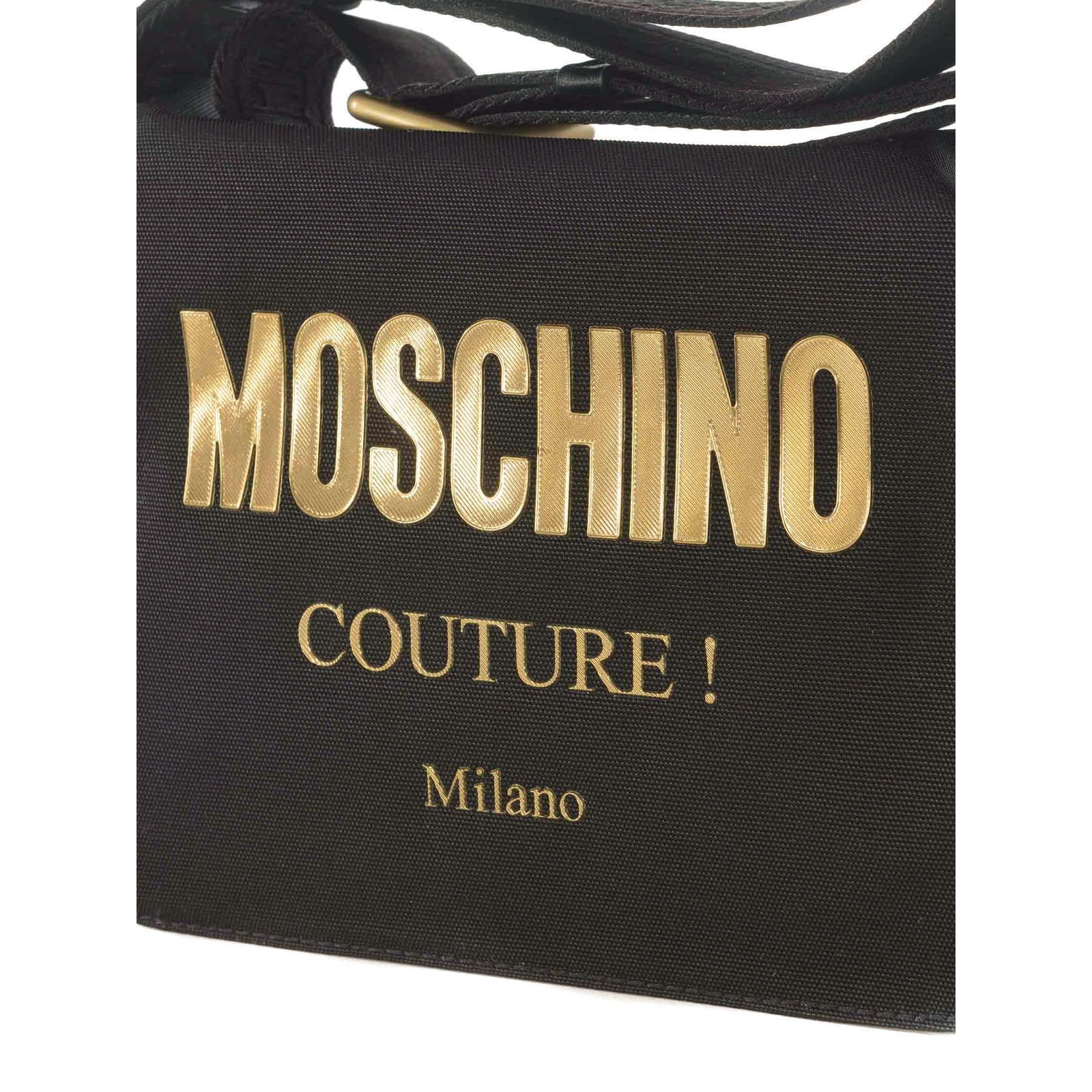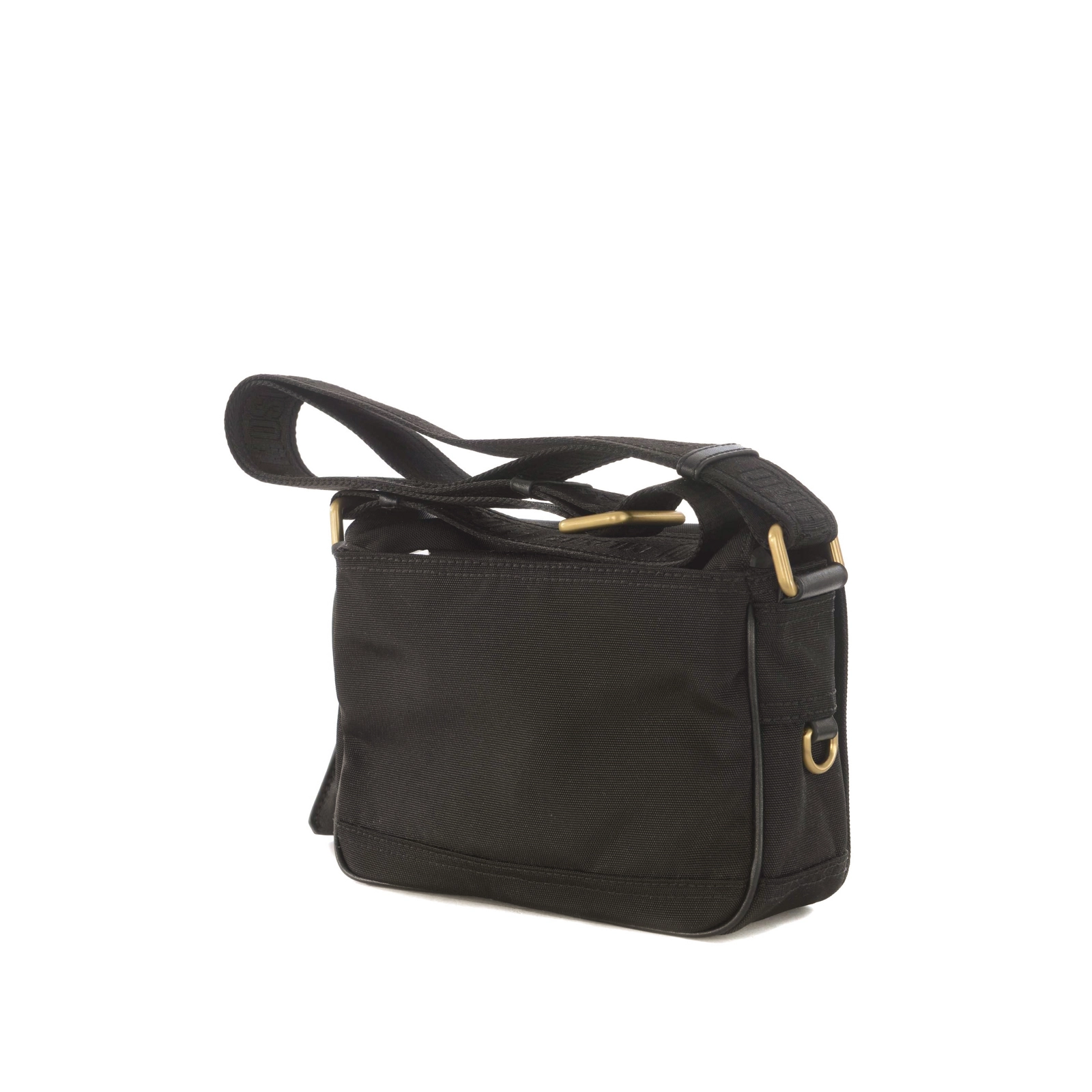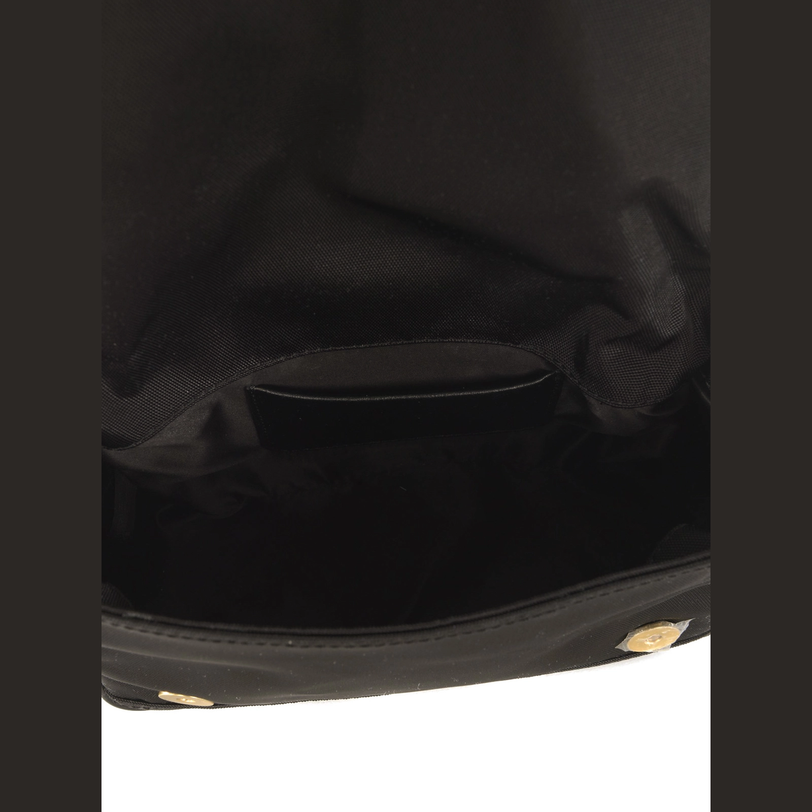 Nylon shoulder bag featuring front logo lettering, detachable charm, magnetic button closure, logo print shoulder strap, one inner patch pocket and back magnetic button pocket.