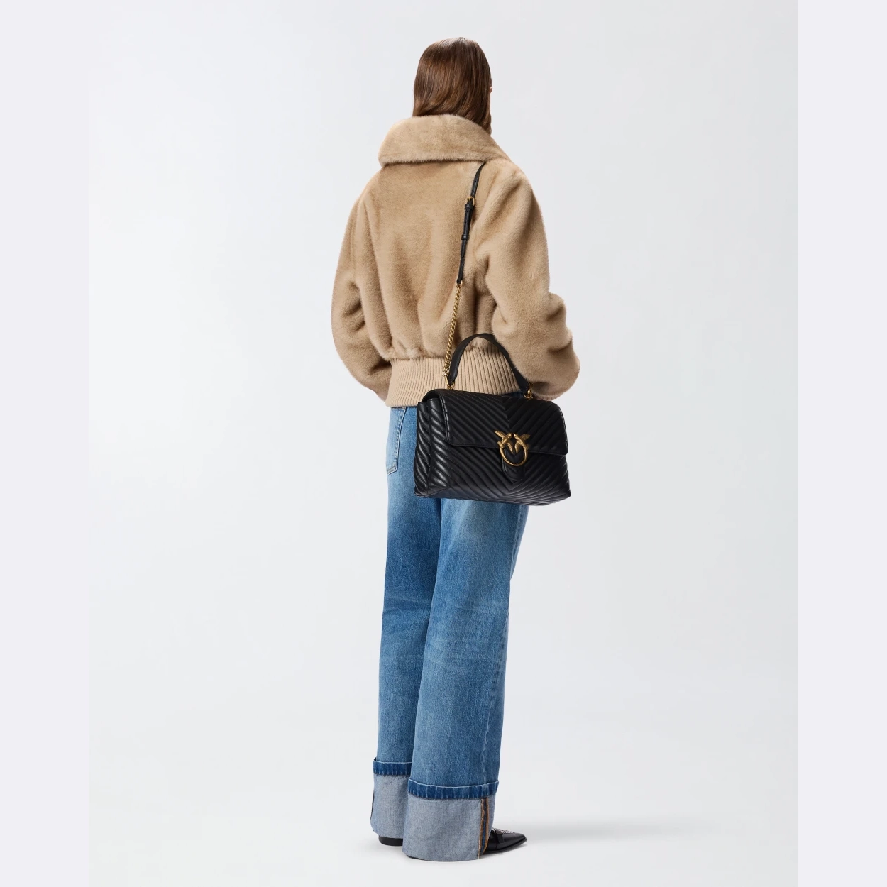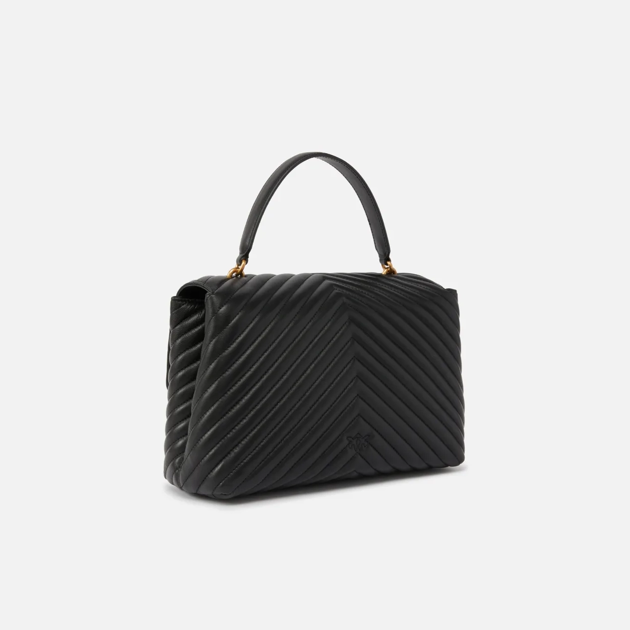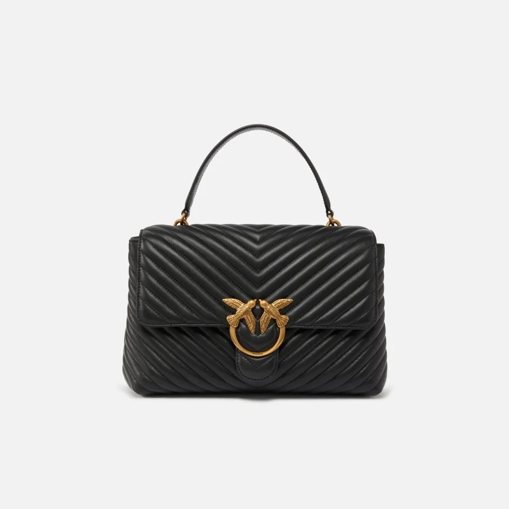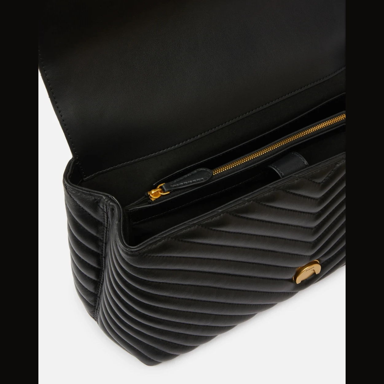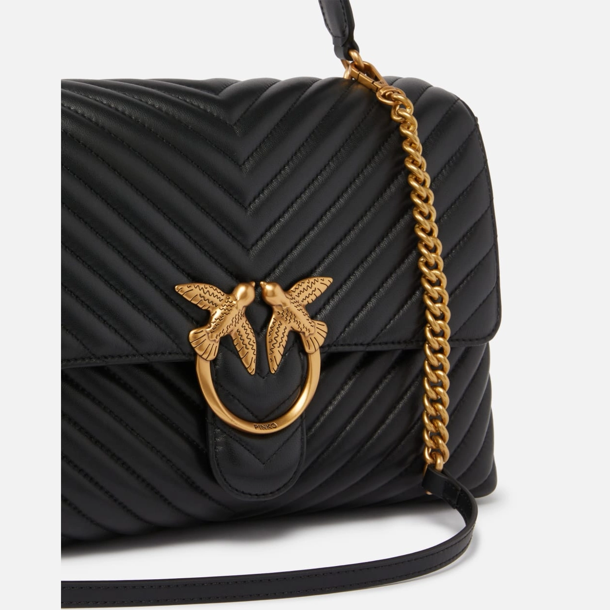 Big Love Bag Puff in quilted nappa leather with chevron pattern. The fastening is embellished with the iconic metal Love Birds Diamond Cut buckle. The accessory boasts a microsuede-lined interior, complete with a zipped centre divider pocket and slip pocket. The shoulder strap combines the classic round metal chain with a practical, adjustable nappa leather pad.
