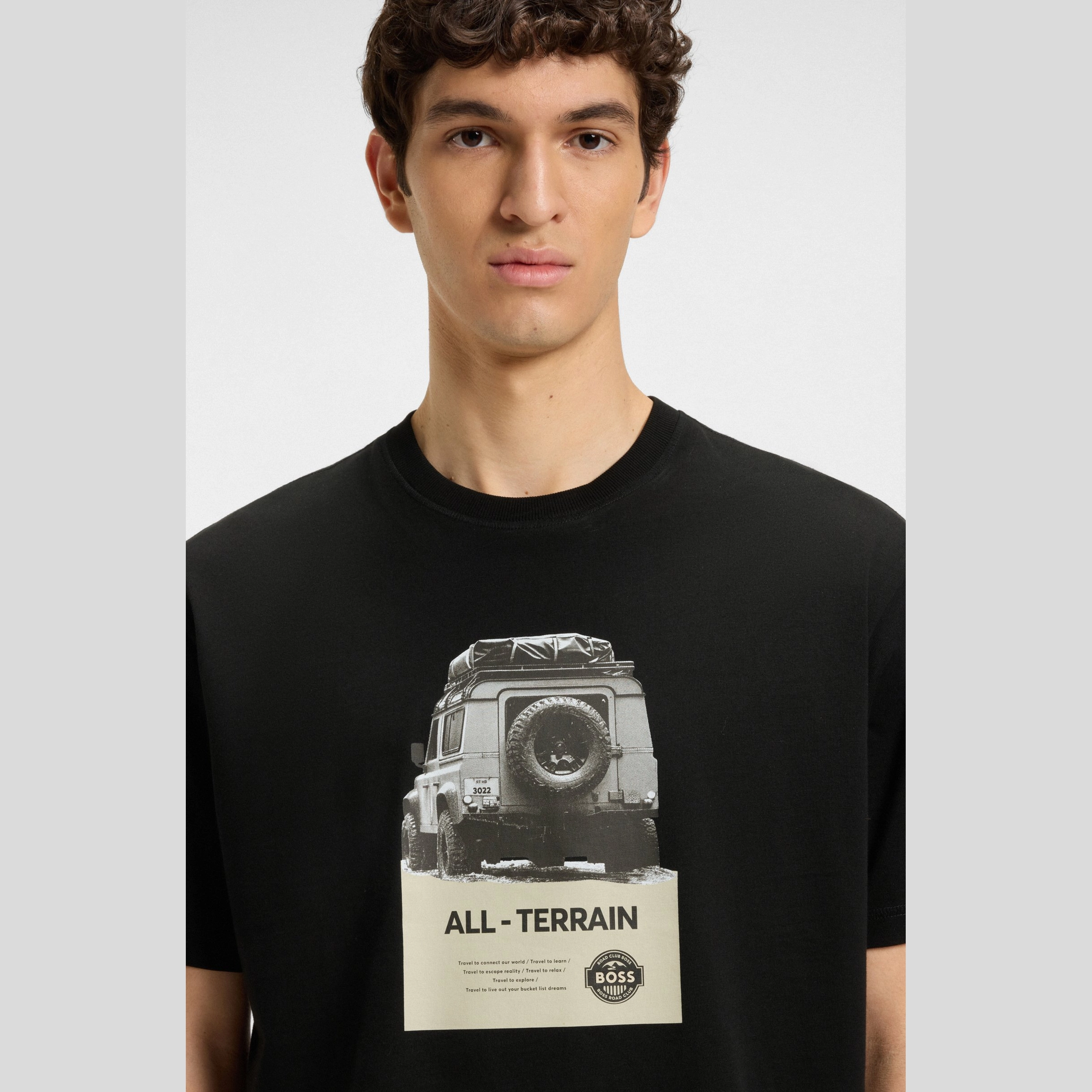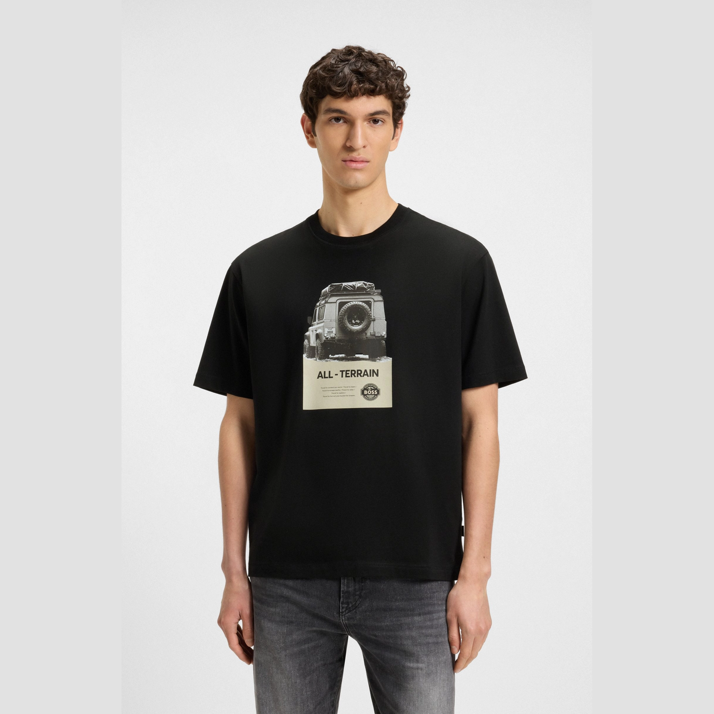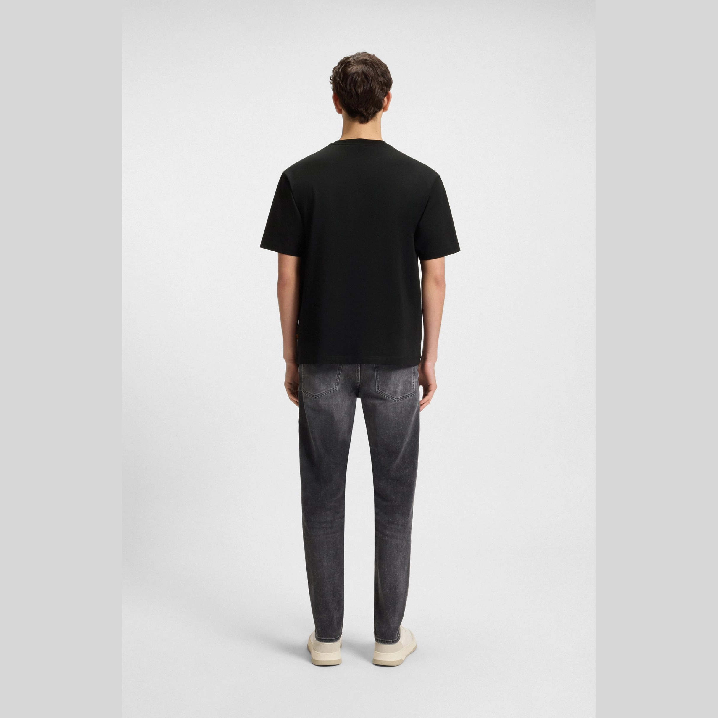 In cotton with added stretch for comfort, this BOSS Menswear T-shirt is printed with a centre-front contrast logo. Laid-back fit.