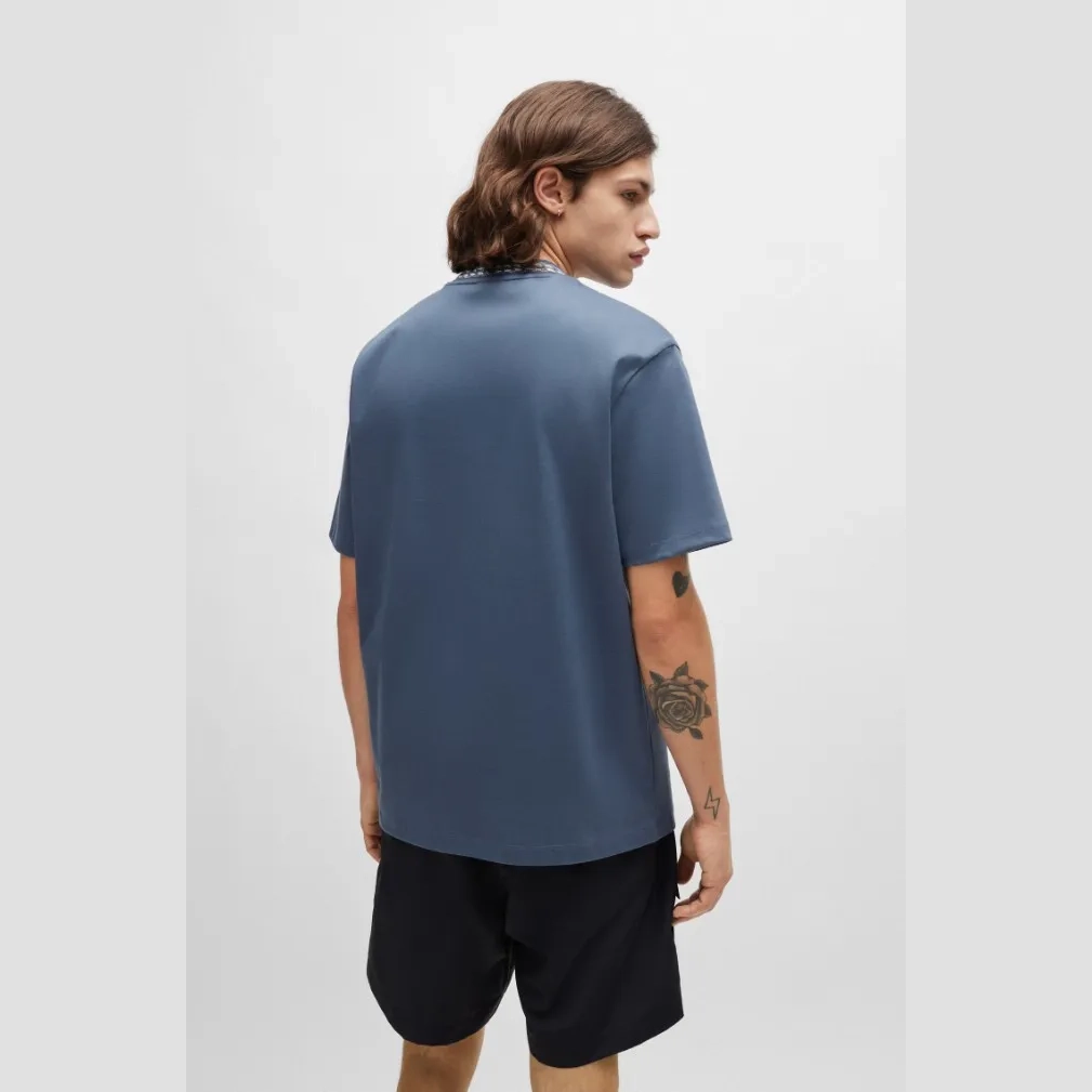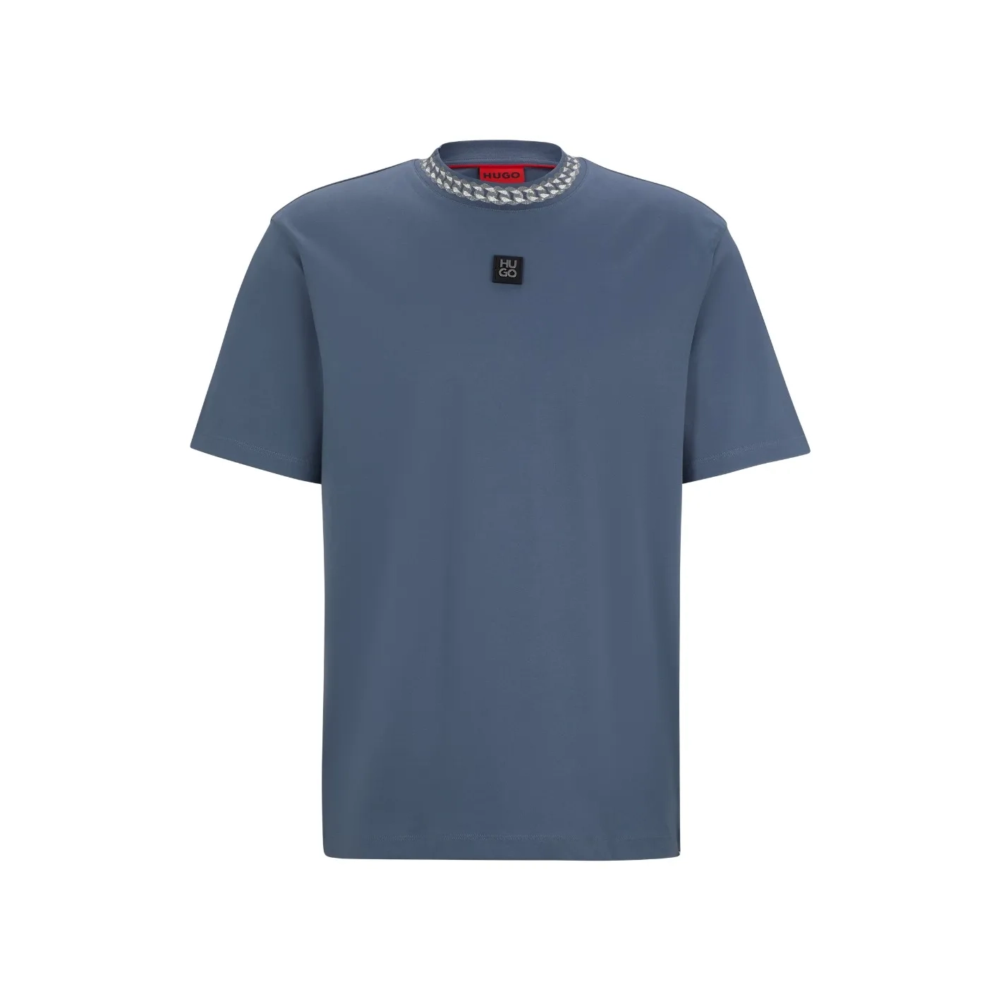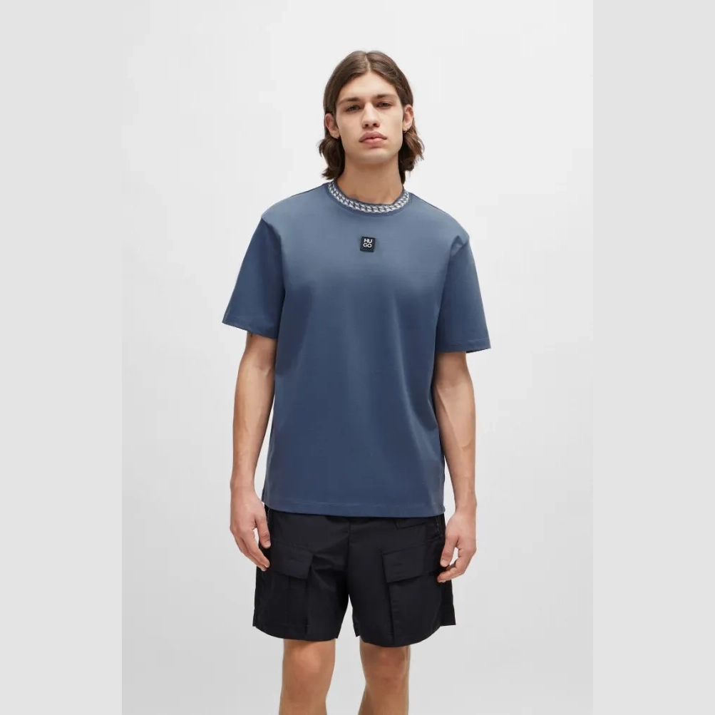 A relaxed-fit short-sleeved T-shirt by HUGO Men, crafted from super-soft interlock fabric and featuring a chain-print collar. As part of our CLEAN UP YOUR ACT initiative, this item contains at least 60% more responsible raw materials. This piece is made with cotton grown in line with HUGO BOSS’s commitment to using cotton and plant fibers from sources that apply improved management practices for the benefit of people and the environment.