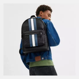 West Backpack In Signature Canvas With Varsity Stripe